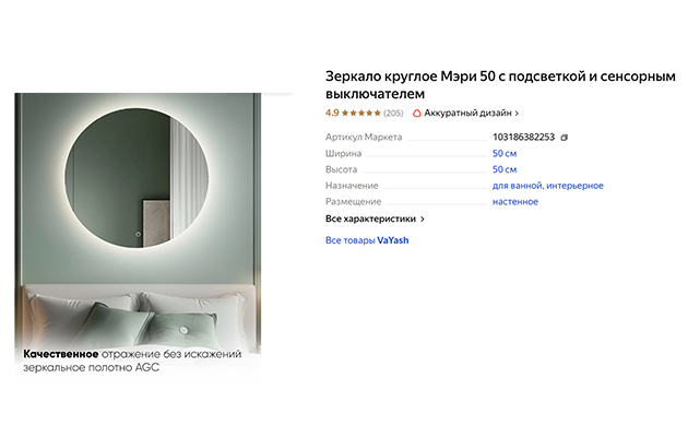 Зеркало очень четко передает изображение, поэтому завоевало популярность не только как домашний декор, но и как незаменимый помощник в фотостудиях и гримерных. В комплекте идет шнур, предусмотрены скрытые петли для размещения на стене. Лампочки в комплект не входят, но, по отзывам пользователей, подобрать их довольно легко. Зеркало дает много света и часто становится основным источником освещения комнаты. А вот отсутствие регулировки мощности светопотока может огорчить.