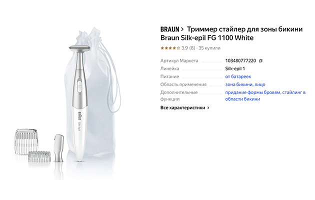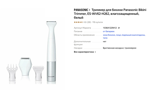 | Количество насадок | 4 насадки: узкий триммер, насадка-пилинг для зоны бикини, регулируемая насадка-гребень, бритвенная головка |