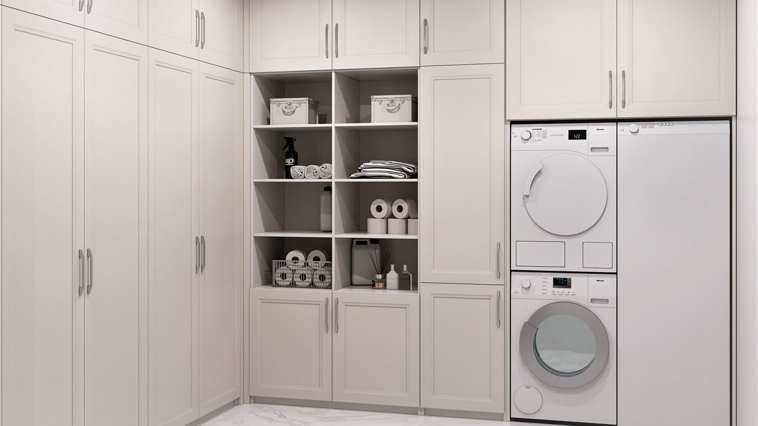 Угловая гардеробная, состоящая из шкафов, стеллажей, ниши для стиральной и сушильной машин, а также места под холодильник. Благодаря этой конструкции в ванной комнате и на кухне освободится пространство.