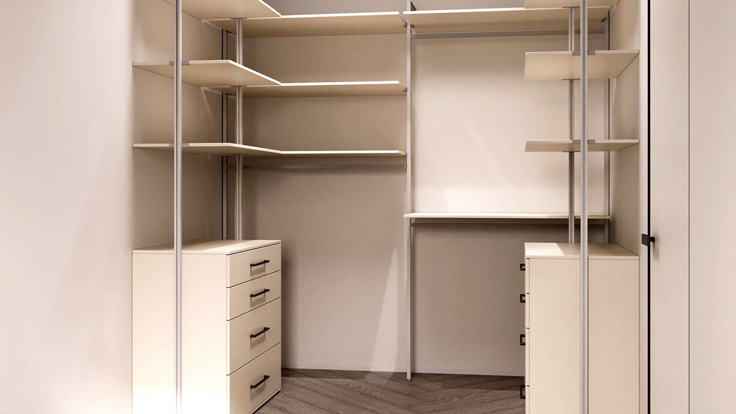 Компактная гардеробная, которая может устанавливаться в небольшое отдельное помещение или нишу в спальне. Она включает вместительные открытые полки, штанги и комоды. Вы самостоятельно выбираете материалы, фурнитуру, внутреннее наполнение и размеры. Такое пространство может вместить не только одежду и обувь, но и хозяйственные предметы и бытовую технику.
