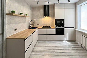 Угловой кухонный гарнитур с фасадами из ЛДСП. Он включает зоны хранения в верхней и нижней частях, с выдвижными и распашными шкафчиками. Мебель изготавливается в стилях «Лофт», «Модерн», «Классика».