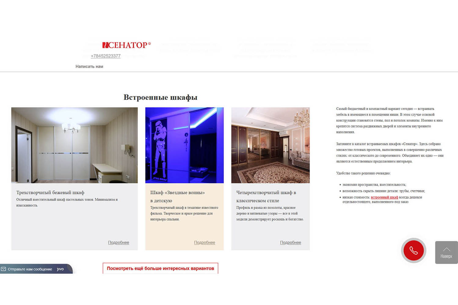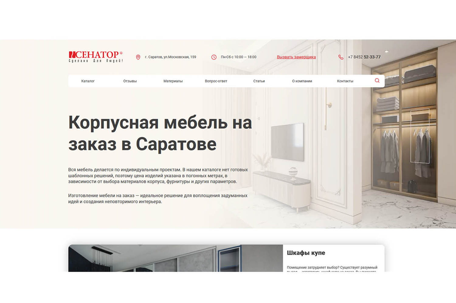 «Сенатор» — компания по изготовлению и установке мебели на заказ. Она работает в Саратове и Саратовской области с 1995 года. Основной профиль — шкафы-купе и гардеробные комнаты. Также есть распашные и книжные шкафы, офисная мебель: для кабинетов, торговых залов, переговорных и других помещений.