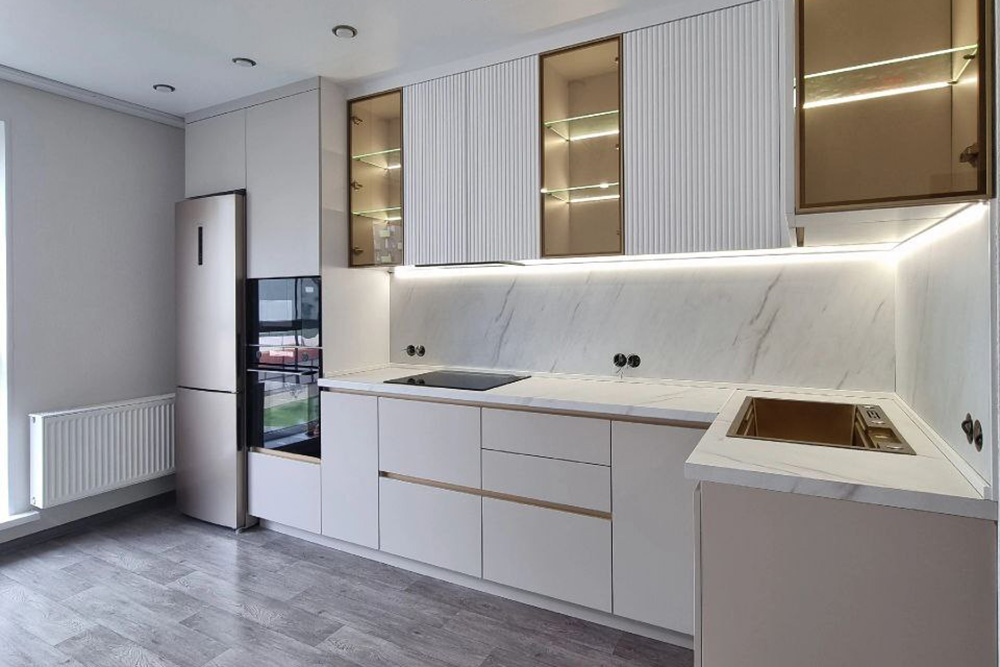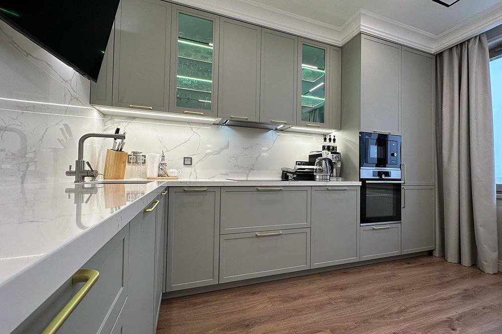 Угловая кухня предполагает рациональное использование пространства. Компоновка позволяет разместить рабочую зону, техник и систему хранения так, чтобы все было под рукой. При заказе можно выбрать тип столешницы, расположение модулей, подсветку и прочие элементы. Гарнитур изготавливается по индивидуальным размерам.