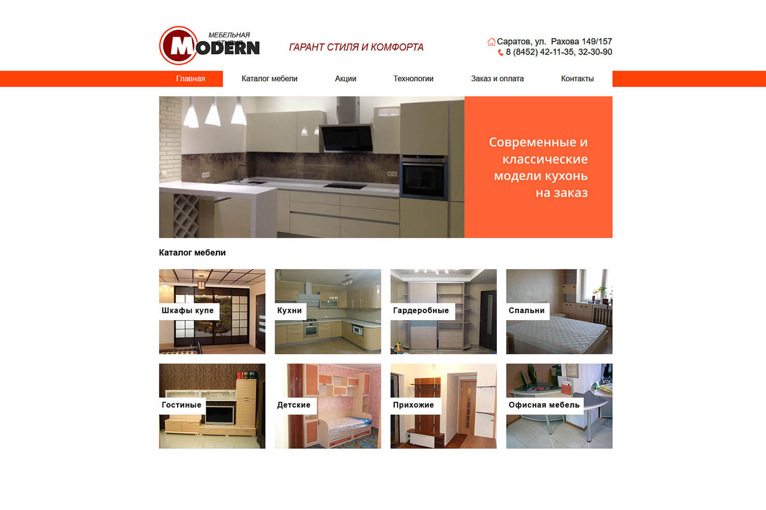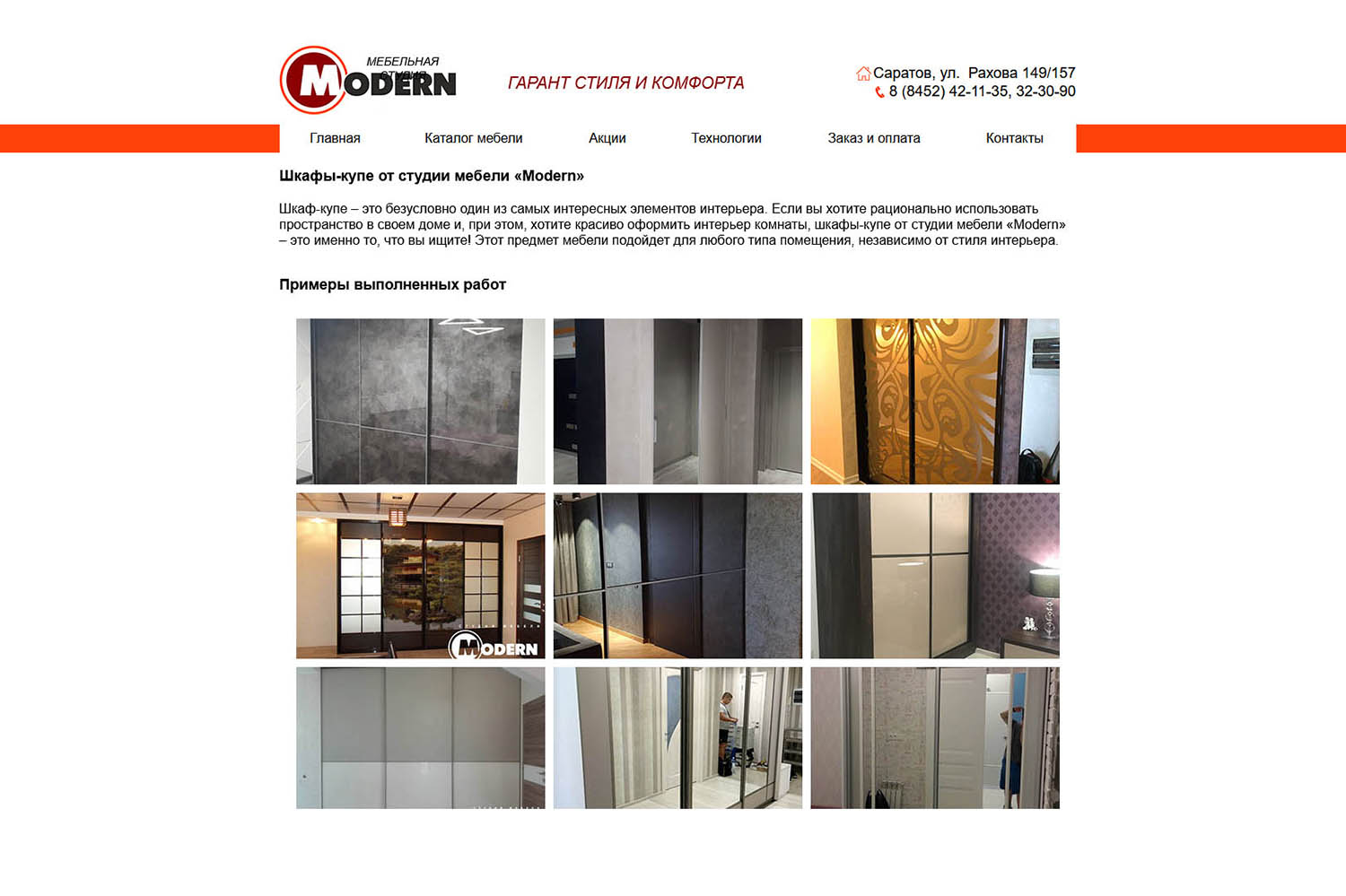 Студия Modern работает в Саратове более десяти лет. Компания занимается изготовлением на заказ шкафов-купе, гардеробных, кухонных гарнитуров, наборов мебели для спальни, детской, гостиной, прихожей. Также в каталоге есть предложения для офисов, баров, торговых точек, салонов красоты. В производстве используются ЛДСП, МДФ, зеркальные и стеклянные фасады и вставки.
