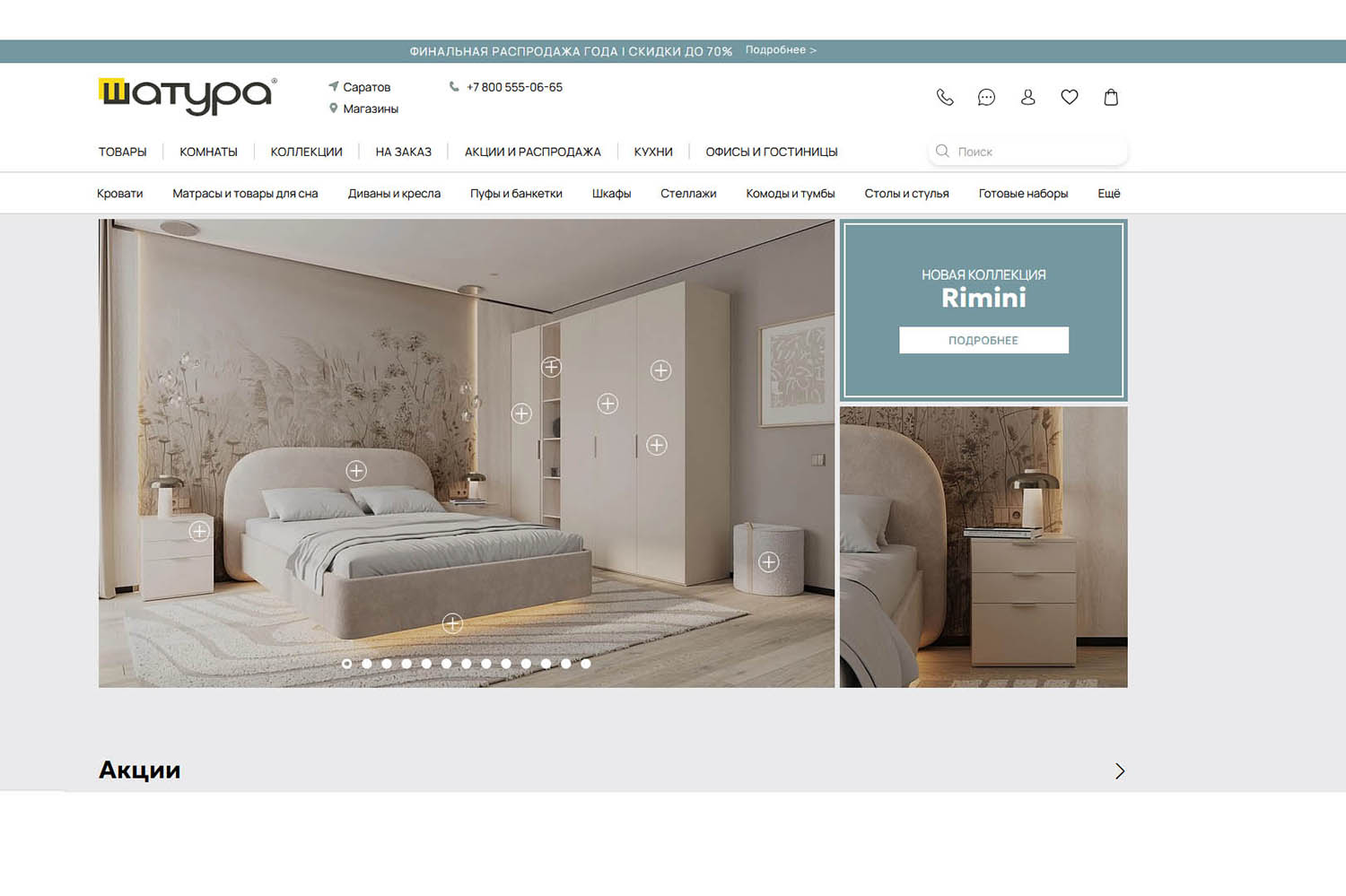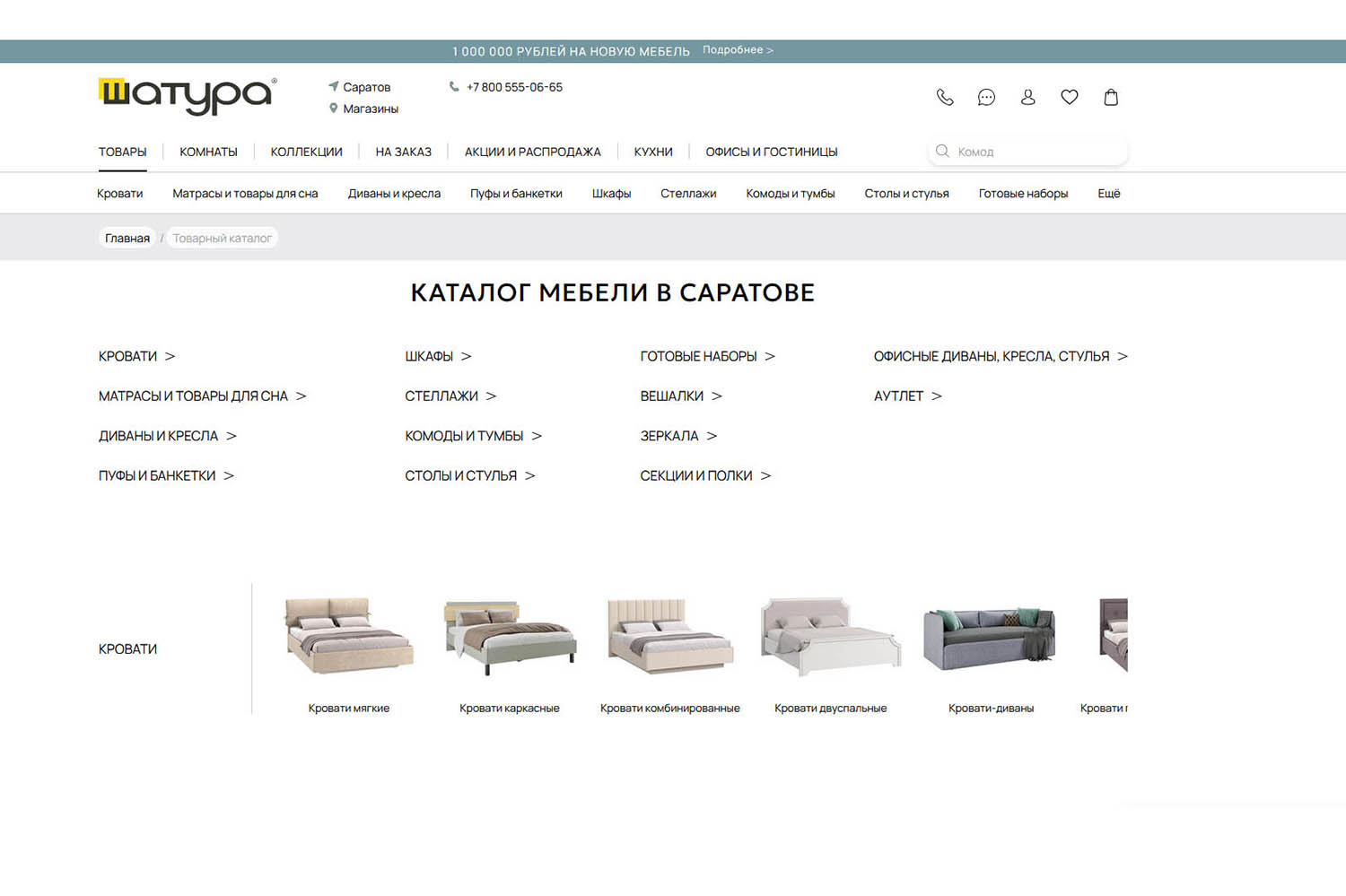 Мебельная фабрика «Шатура» ведет свою историю с 1961 года. В Саратове находятся три торговые точки компании и один склад. Компания производит мебель для спален, гостиных, прихожих, кухонь: как готовые наборы, так и отдельно шкафы, тумбы, комоды, кровати, стеллажи, диваны, кресла, столы, стулья. В ассортименте есть также предложения для офисов.