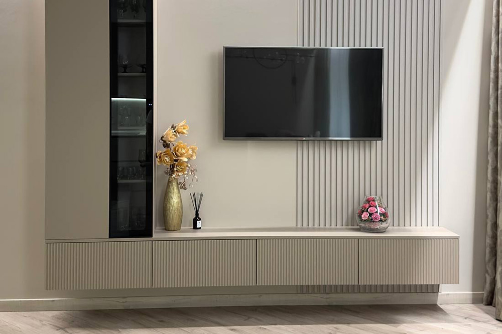 Наборы мебели для гостиной состоят из отдельных модулей: секции под ТВ, тумбы, навесные полки, шкафы. Проект разрабатывают под дизайн интерьера, гарнитур изготавливают по индивидуальным размерам комнаты.