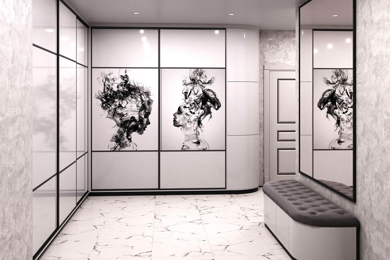Фасад шкафа может быть любой: от зеркал и бамбуковых панелей до стекол с фотопечатью. На изготовление уходит семь-десять дней в зависимости от сложности задачи. Установка входит в ценник и рассчитывается индивидуально.