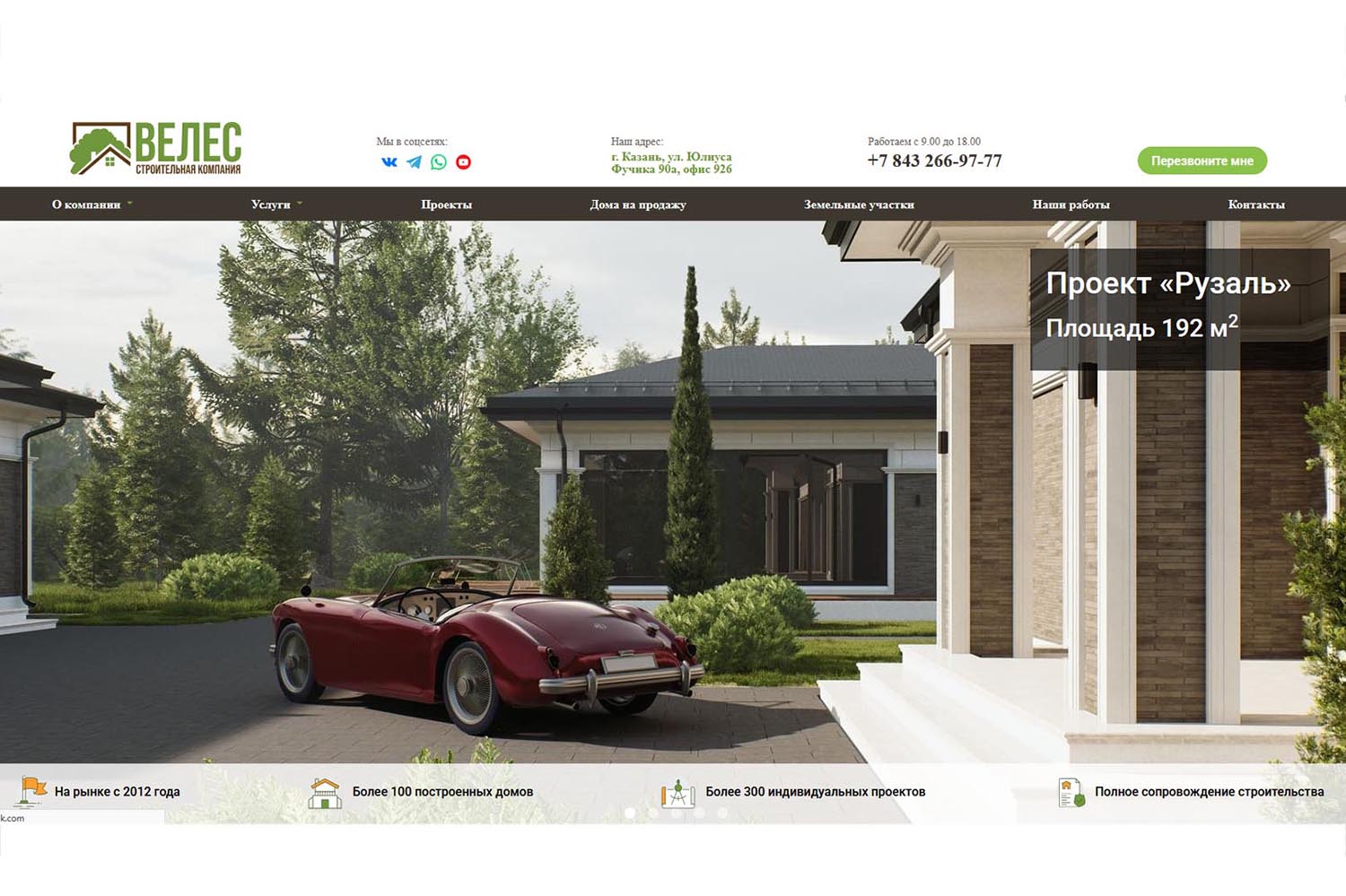 Компания «Велес» работает на строительном рынке Казани и Республики Татарстан с 2012 года. Она предлагает весь комплекс услуг: от выбора и юридической проверки участка, геологии, разработки проекта, возведения дома и подведения инженерных сетей (газ, вода, электричество) до помощи в регистрации объекта.