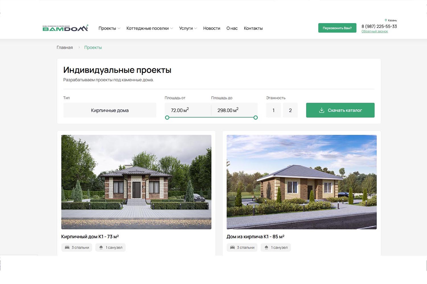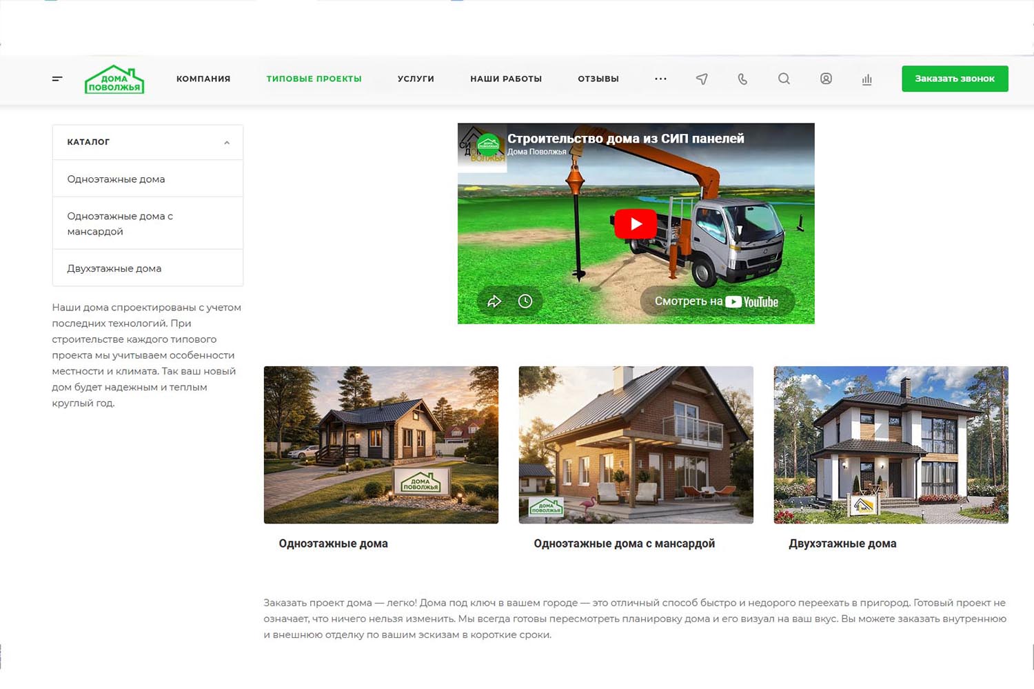 В каталоге выбор одно- и двухэтажных домов по типовым проектам. Также можно заказать составление индивидуального плана. Компания помогает подобрать участок, если это необходимо. Организация работает с федеральными программами «Ипотечное кредитование», «Молодая семья» и «Материнский капитал». Проконсультироваться можно по телефону, через форму «Задать вопрос» на сайте, по электронной почте или при личном визите в один из офисов.