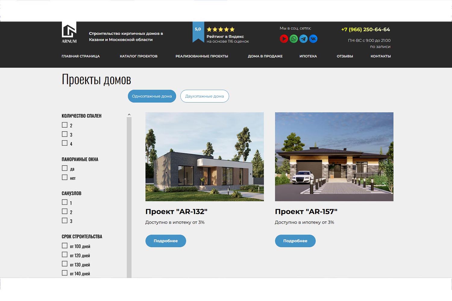 В цикл работ входят геологический анализ грунта, строительство, включая внутреннюю отделку и уборку территории перед сдачей. Гарантия составляет 7 лет. Компания оказывает помощь в получении ипотеки по любой доступной программе, а также продаже существующей недвижимости. Записаться на консультацию можно по телефону, по электронной почте и в мессенджерах.