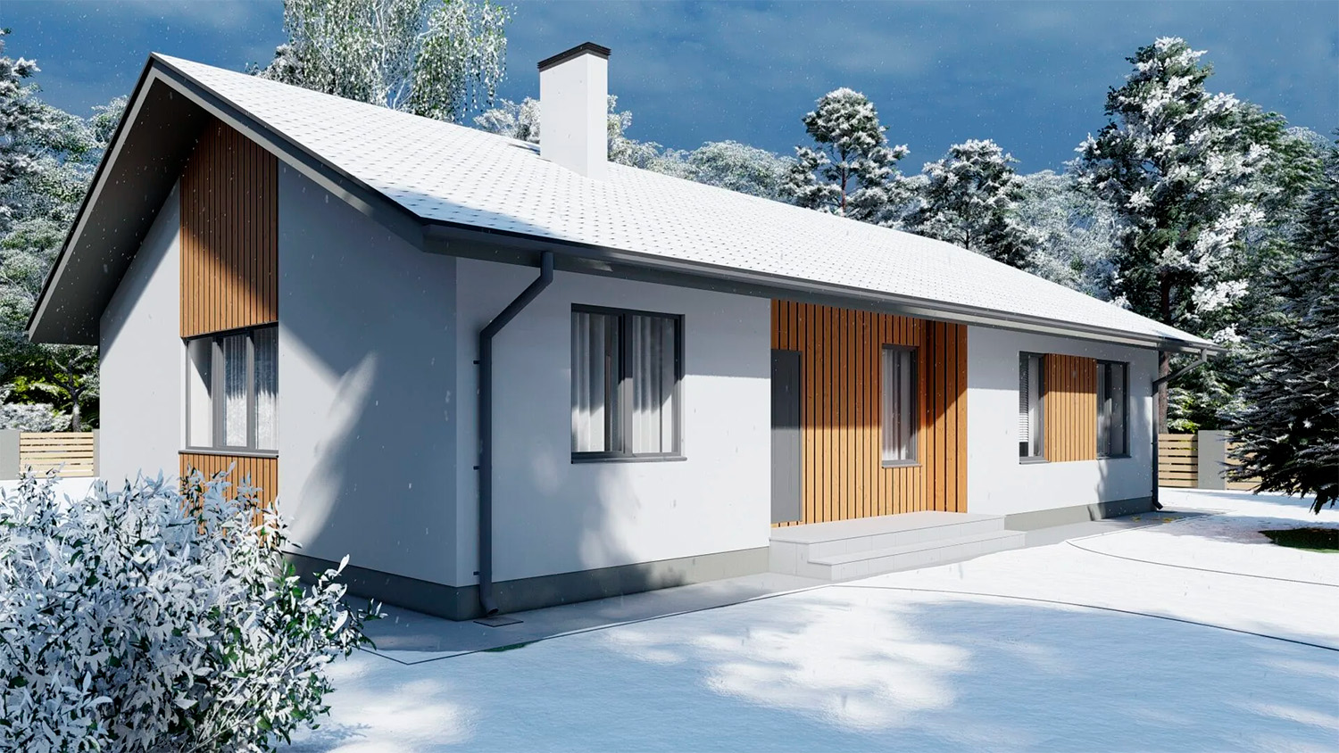 Одноэтажная планировка — быстрый и удобный доступ к любому помещению, что немаловажно для семей с маленькими детьми и пожилых людей. Двускатная кровля и простая форма дома дают возможность снизить затраты на его строительство и содержание. «Дневное» пространство разделено на кухню и гостиную с обеденной зоной. Разграничение ночной и дневной зон дает возможность скрыть частную жизнь дома от посторонних взглядов. Одна из спален обустроена собственной гардеробной и санузлом. Предусмотрены кабинет и кладовая.