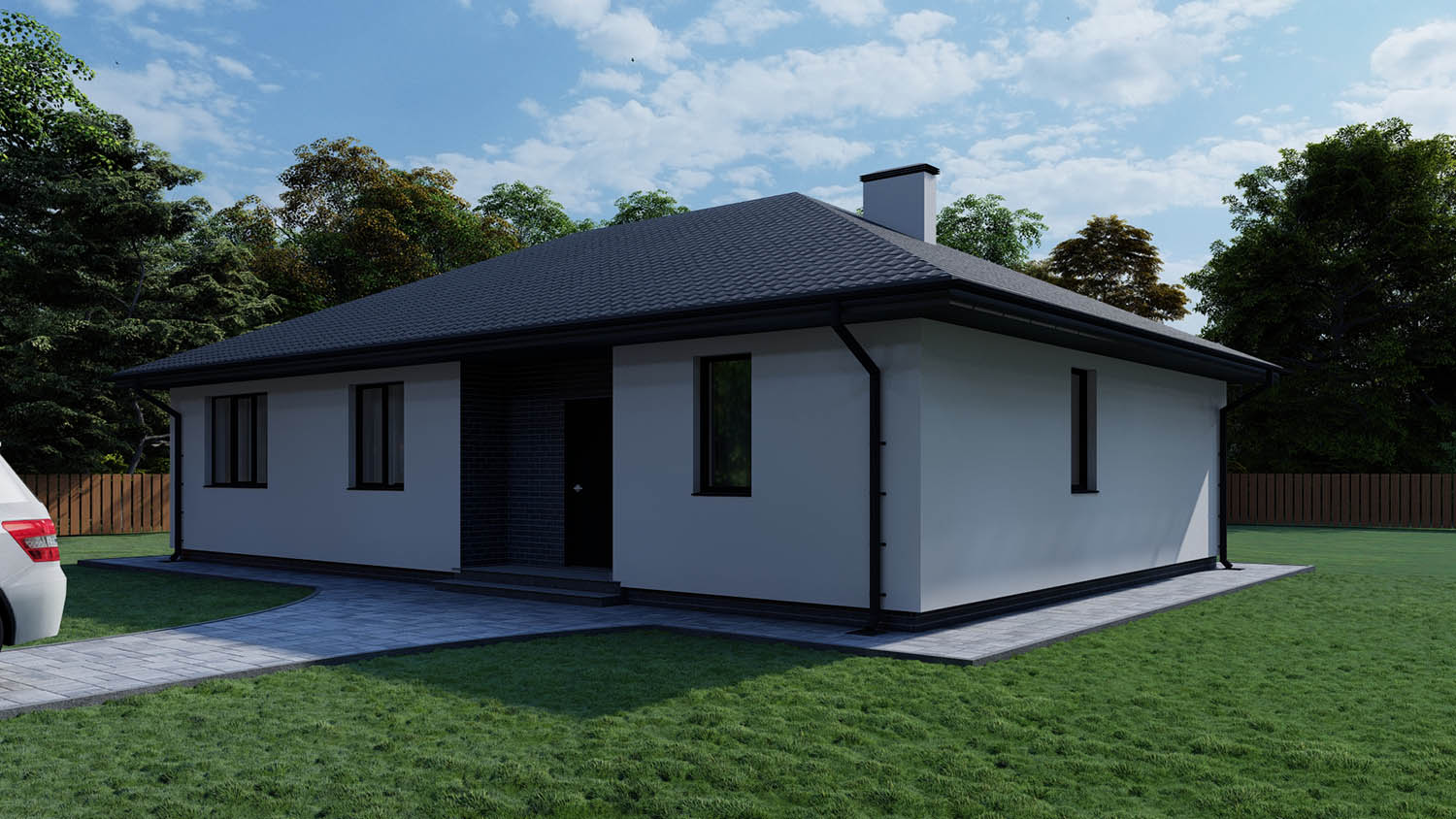 Компактный одноэтажный дом с мастер-спальней и двумя детскими станет отличным загородным жильем для семьи с 2-3 детьми. Выполнен в стиле “минимализм” с вальмовой кровлей. Общая площадь — 115 кв м. Комфортная гостиная объединена со столовой в единое пространство. Также стоит отметить в качестве плюса два санузла. Бюджетный, но достойный вариант загородного дома.