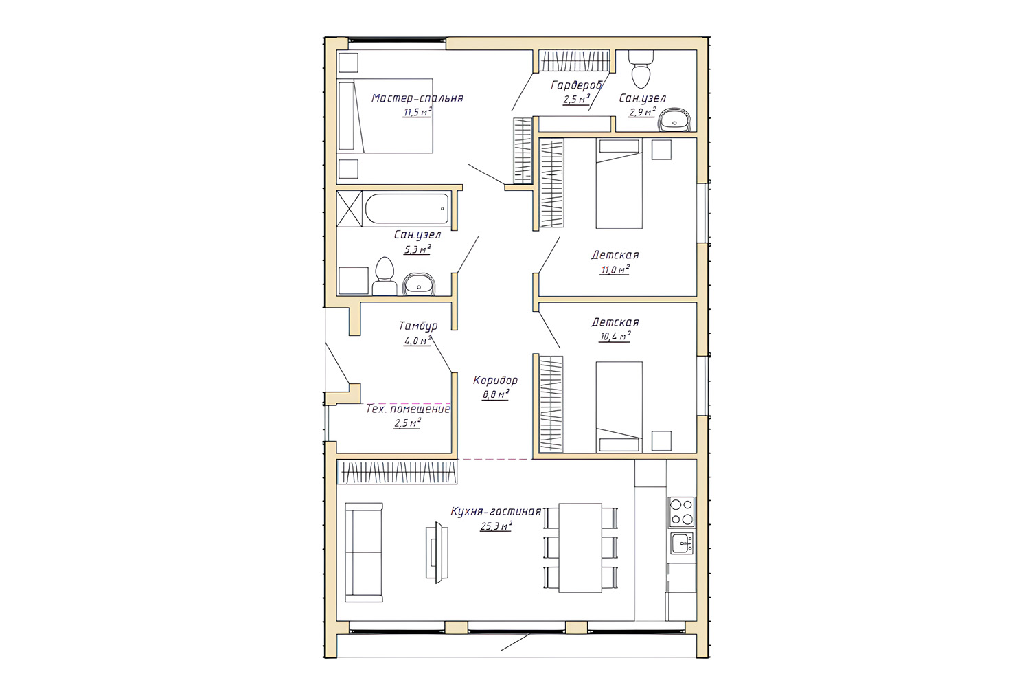 Одноэтажный дом для проживания четырех-пяти человек. Просторная кухня-гостиная площадью 25,45 м2 станет уютным местом для проведения семейных вечеров и встреч с друзьями. Мастер-спальня с отдельной гардеробной и две детских комнаты позволят создать личное пространство для отдыха всех членов семьи.