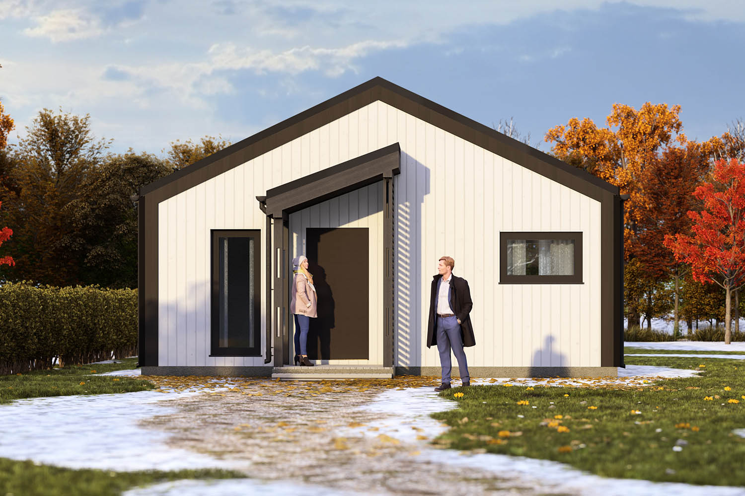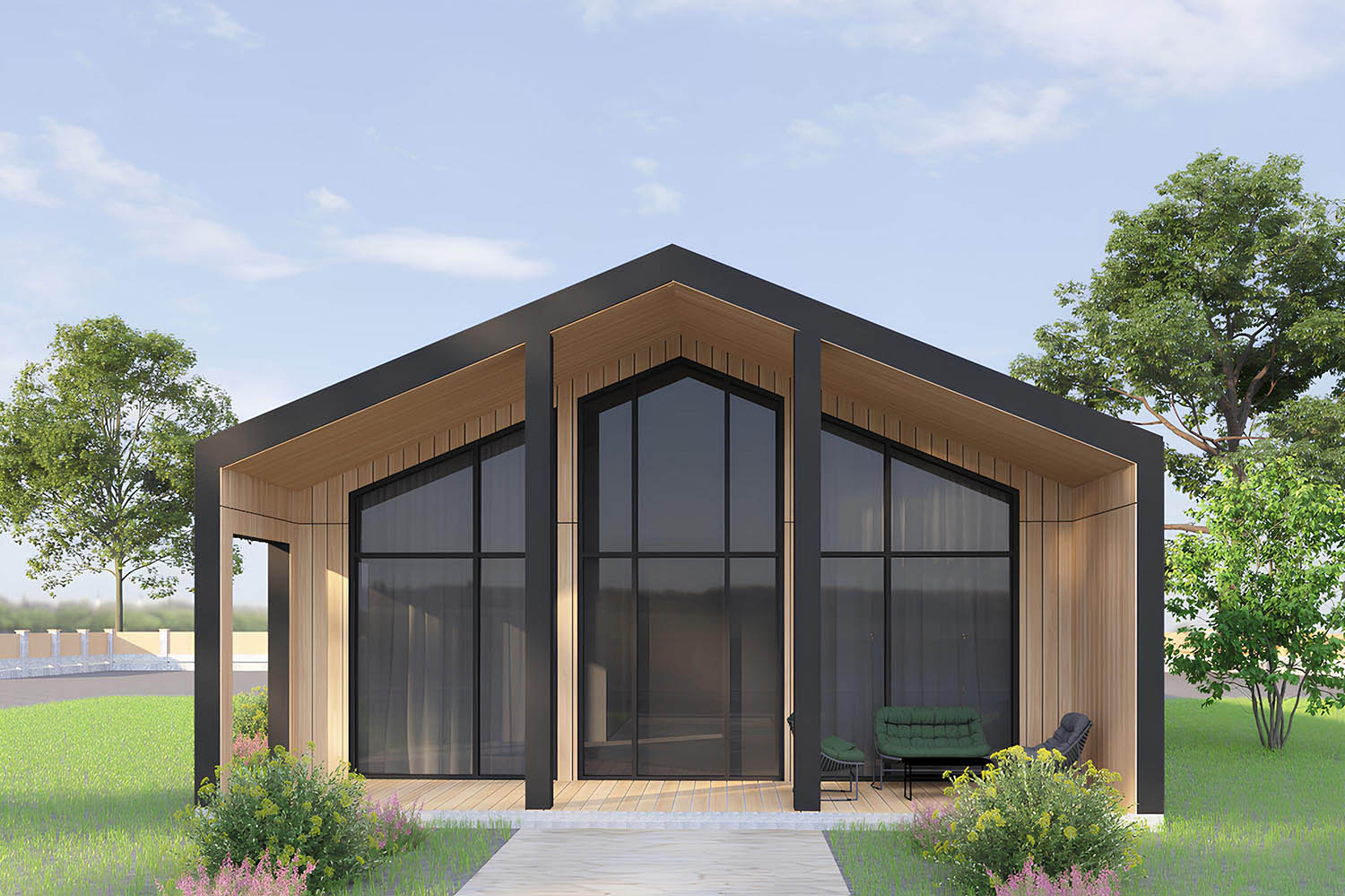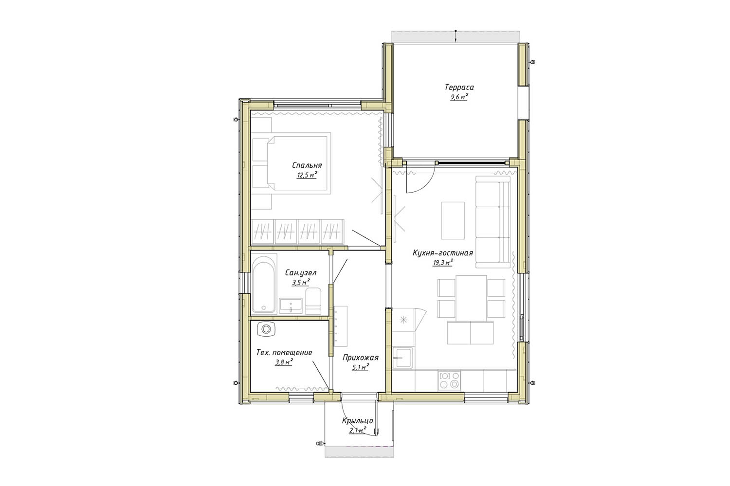 Одноэтажный дом для проживания двух-трех человек и комфортного отдыха с семьей и друзьями. Планировку можно выбрать из двух предложенных: с кухней-гостиной 18.3 м2, одной спальней и террасой, либо двумя спальнями 10,5 и 12,5 м2.