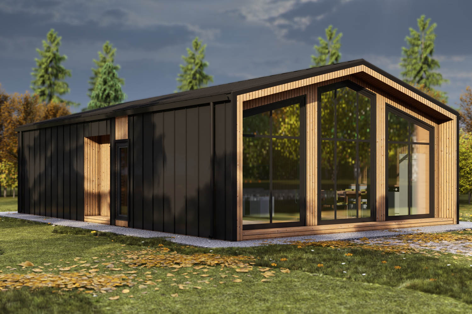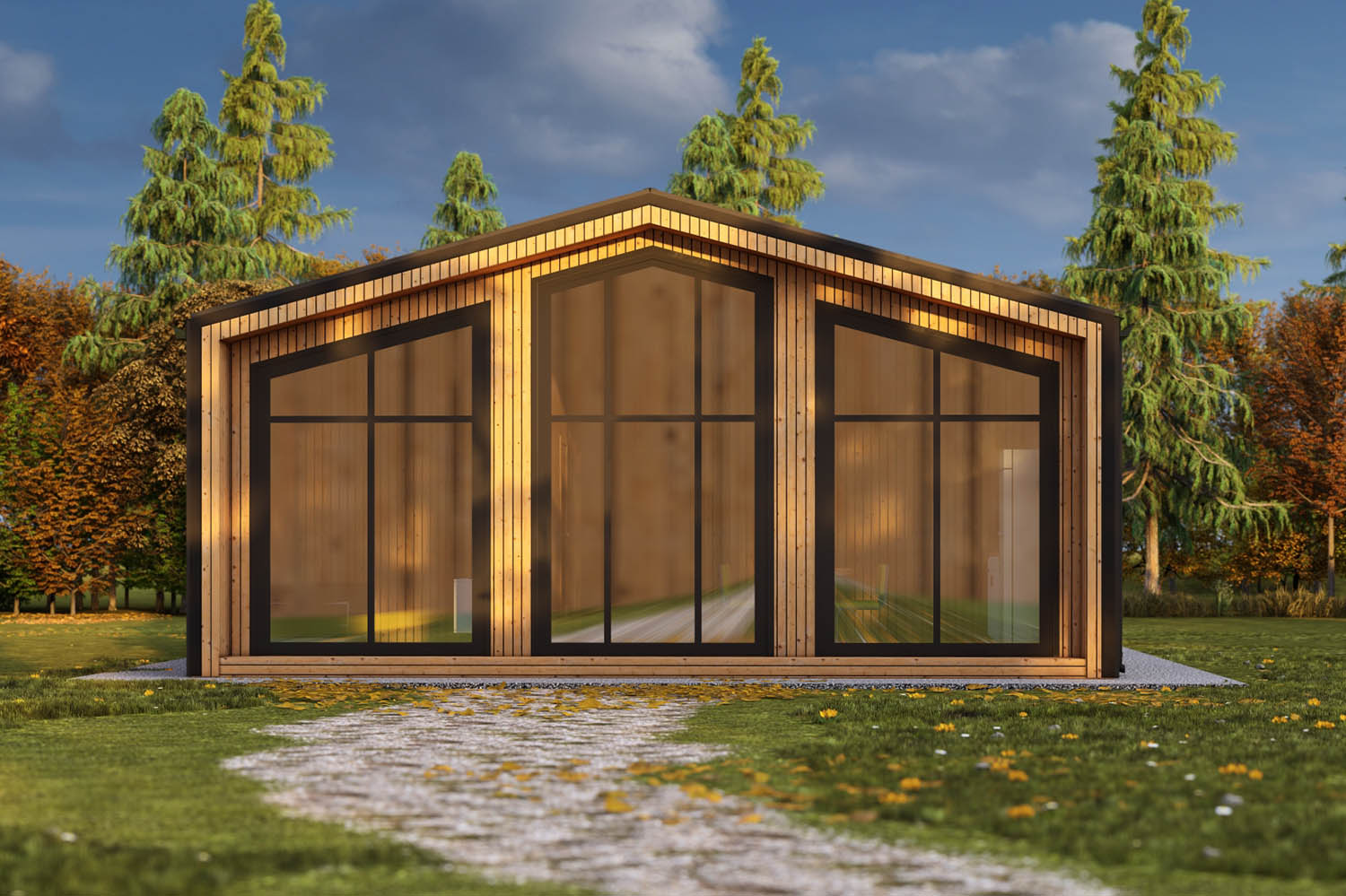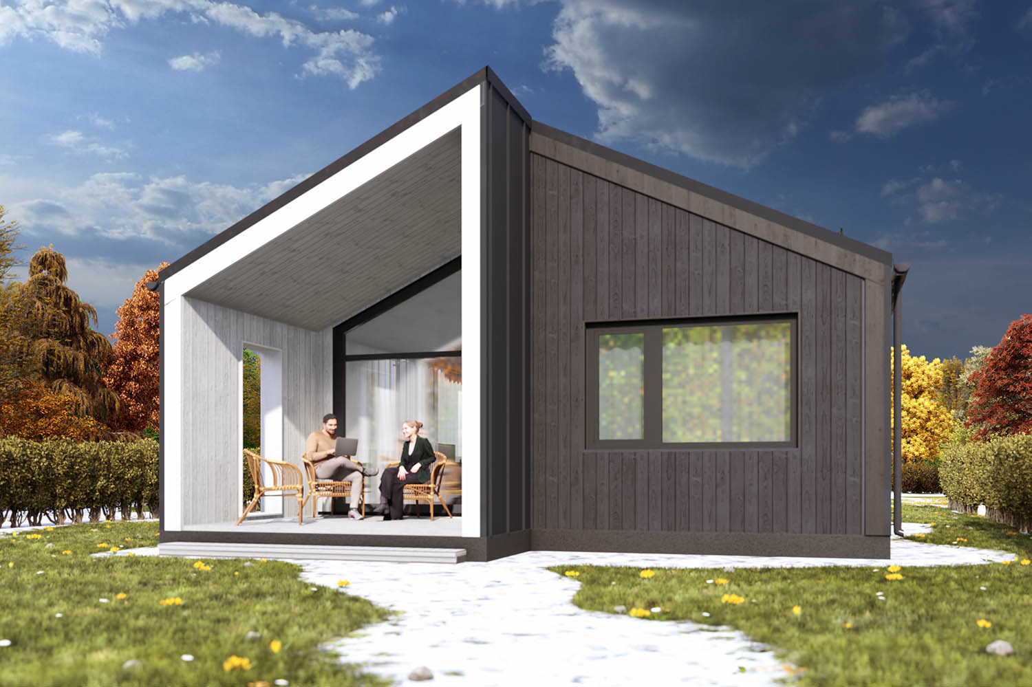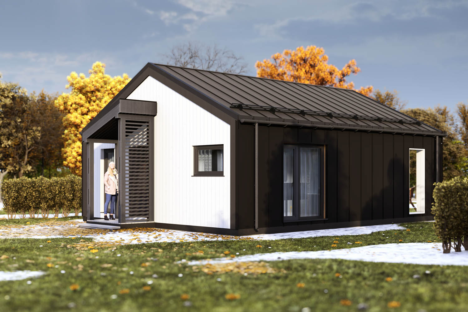 Одноэтажный дом для проживания двух-трех человек и комфортного отдыха с семьей и друзьями. Планировку можно выбрать из двух предложенных: с кухней-гостиной 18.3 м2, одной спальней и террасой, либо двумя спальнями 10,5 и 12,5 м2.