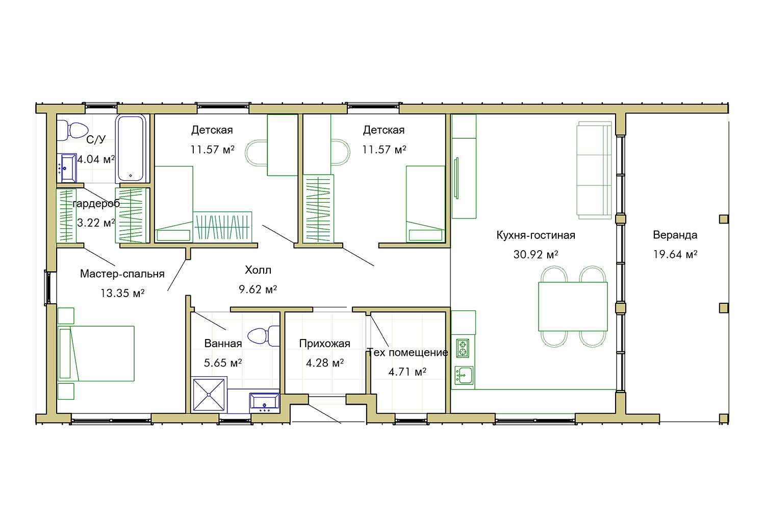 Одноэтажный дом для семьи из четырех-пяти человек. Планировкой предусмотрена мастер-спальня, совмещенная с гардеробной и две детских комнаты. На кухне-гостиной площадью 30,92 м2 можно удобно организовать зону для приготовления пищи и для отдыха. Веранда 19,64 м2 станет отличным местом для вечерних игр с детьми и встреч с друзьями.