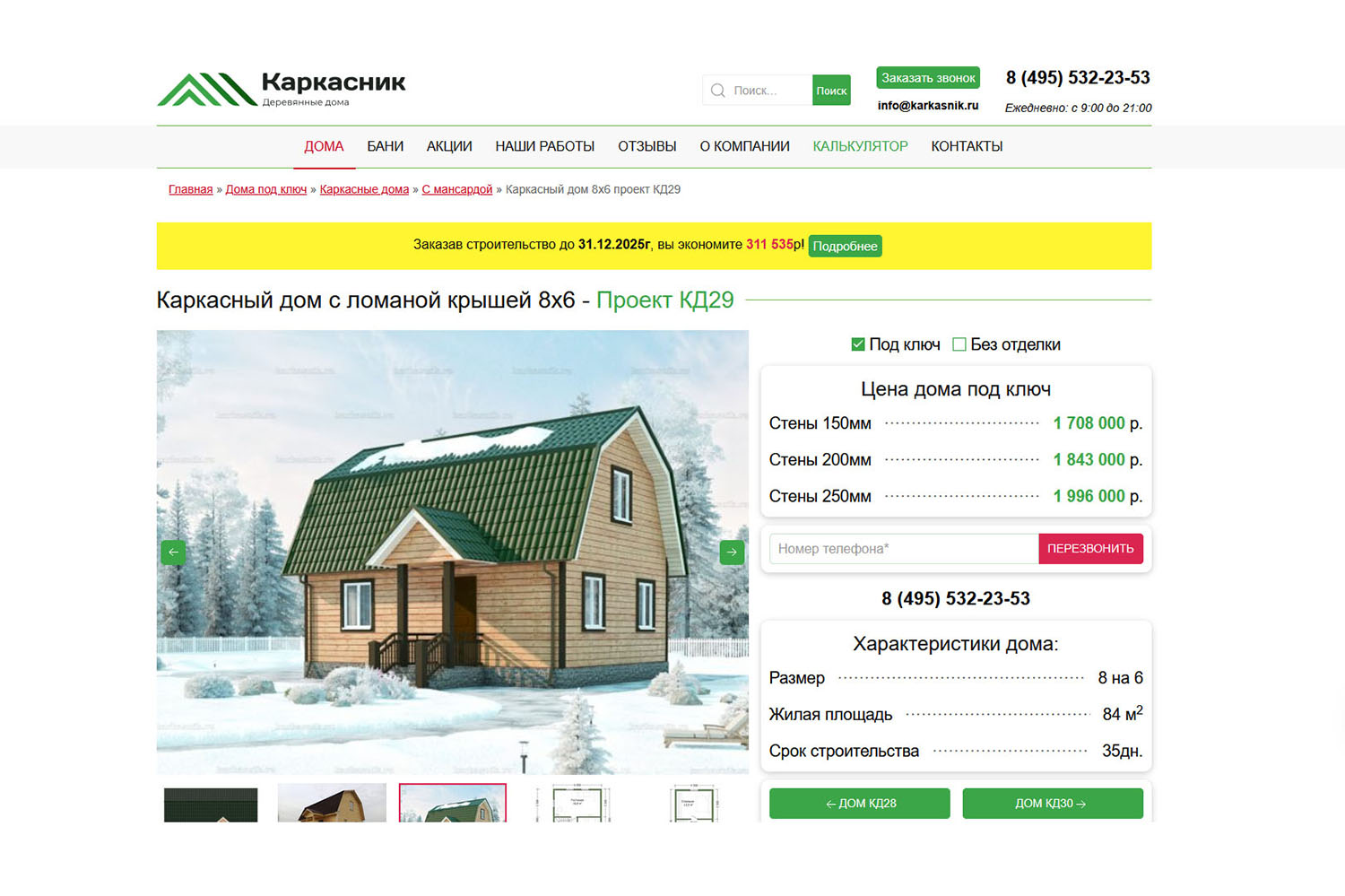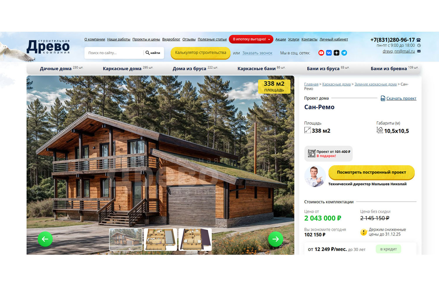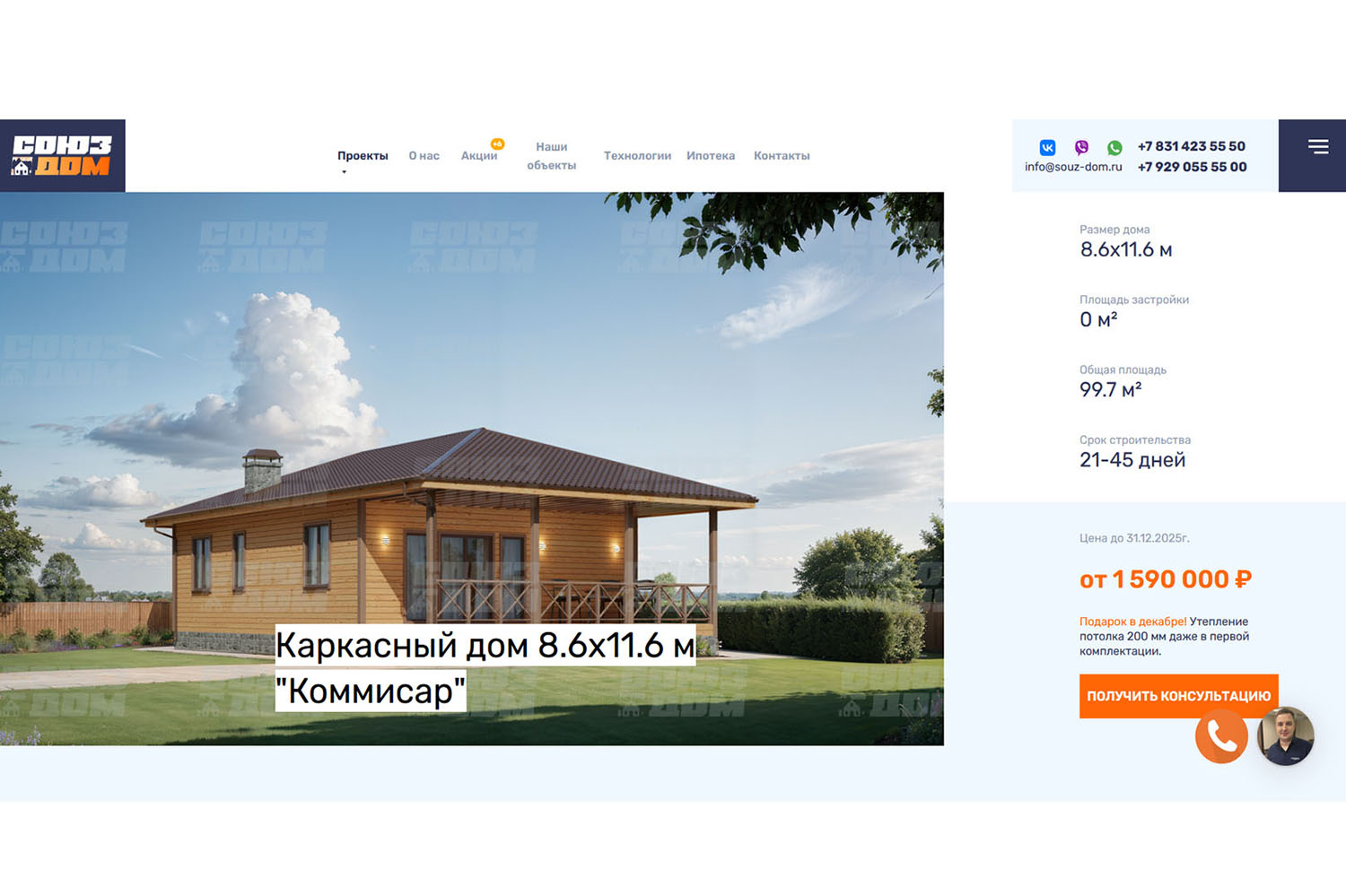 Компания предлагает бонусы и скидки для каждого заказчика. Примерную стоимость дома можно рассчитать с помощью калькулятора на сайте. Через банки-партнеры клиентам доступно оформление ипотечного кредита. Связаться с представителем компании можно по многоканальному телефону и электронной почте.