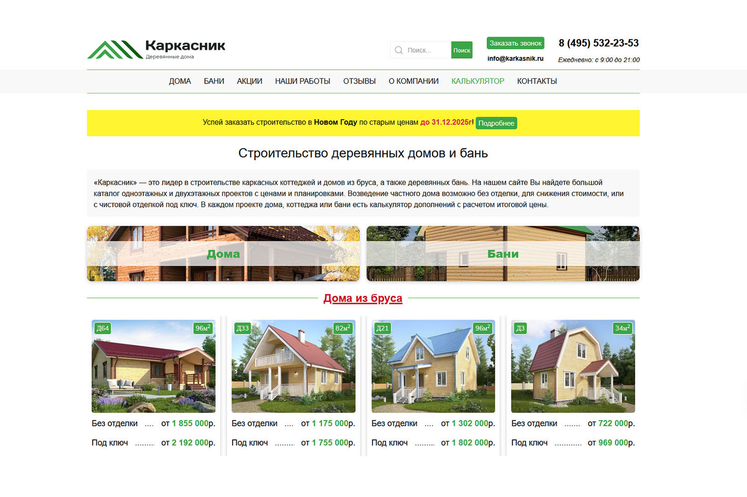 Компания «Каркасник» строит дома и бани «под ключ» в Нижнем Новгороде и Нижегородской области с 2010 года. Работает и в других регионах России. Строительство осуществляется по типовым проектам, которые заказчик может адаптировать под себя.