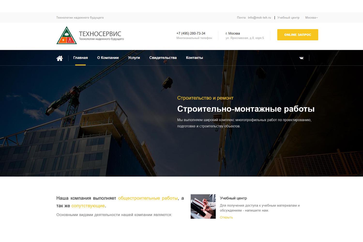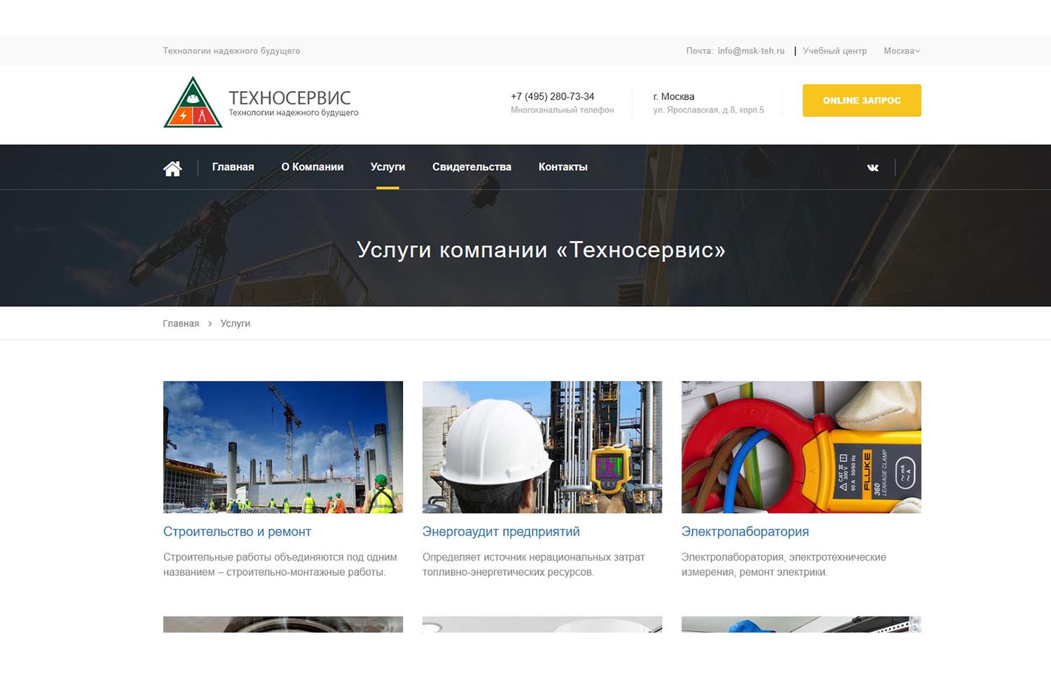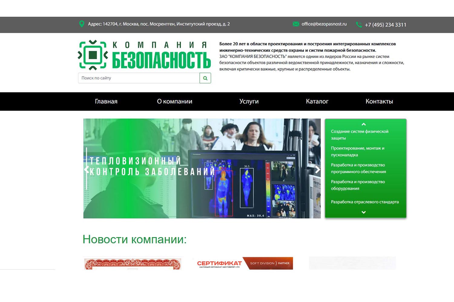 В перечень услуг компании входят: проектирование и монтаж комплексов видеонаблюдения, монтаж приборов распознавания лиц, турникетов, прокладка инженерных сетей (кабели, пожарный водопровод). Установка оповещения возможна с выводом сигнала на центральный пульт Росгвардии. Также предлагается монтаж систем пожарной безопасности (сигнализаций, устройств для ликвидации пожара), огнезащитная обработка конструкций, составление планов эвакуации. Компания осуществляет техническое обслуживание и ремонт оборудования.