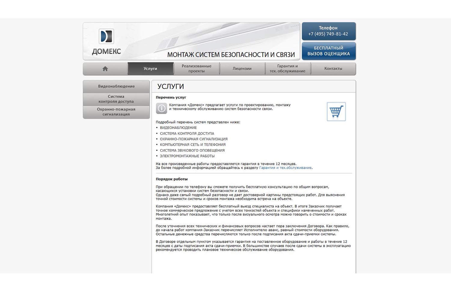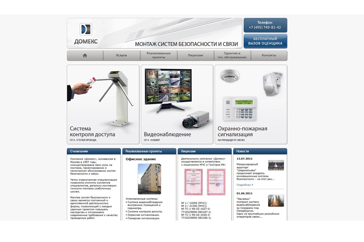 «Домекс» с 1997 года оказывает услуги «под ключ»: проектирование, монтаж и настройка систем видеонаблюдения, охранно-пожарной сигнализации, локальных компьютерных сетей, внутренних телефонных сетей, СКУД, систем звукового оповещения. Компания работает с юридическими лицами: офисами, складами, различными предприятиями.