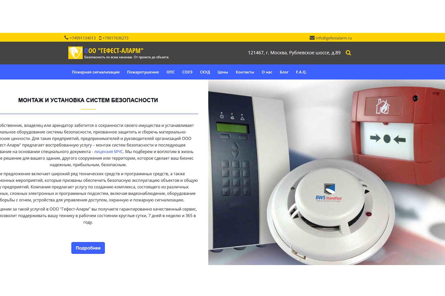 «ГЕФЕСТ-АЛАРМ» проектирует и устанавливает системы безопасности на частных и коммерческих объектах. Специализация компании — установка противопожарных комплексов «под ключ». Сюда входит составление проекта, подключение пожарного накопительного резервуара и насосов, прокладка водопровода, монтирование оросителей (спринклеров). Услуги компании также включают монтаж видеонаблюдения, СКУД, охранных сигнализаций, подготовку документов для получения лицензии МЧС.