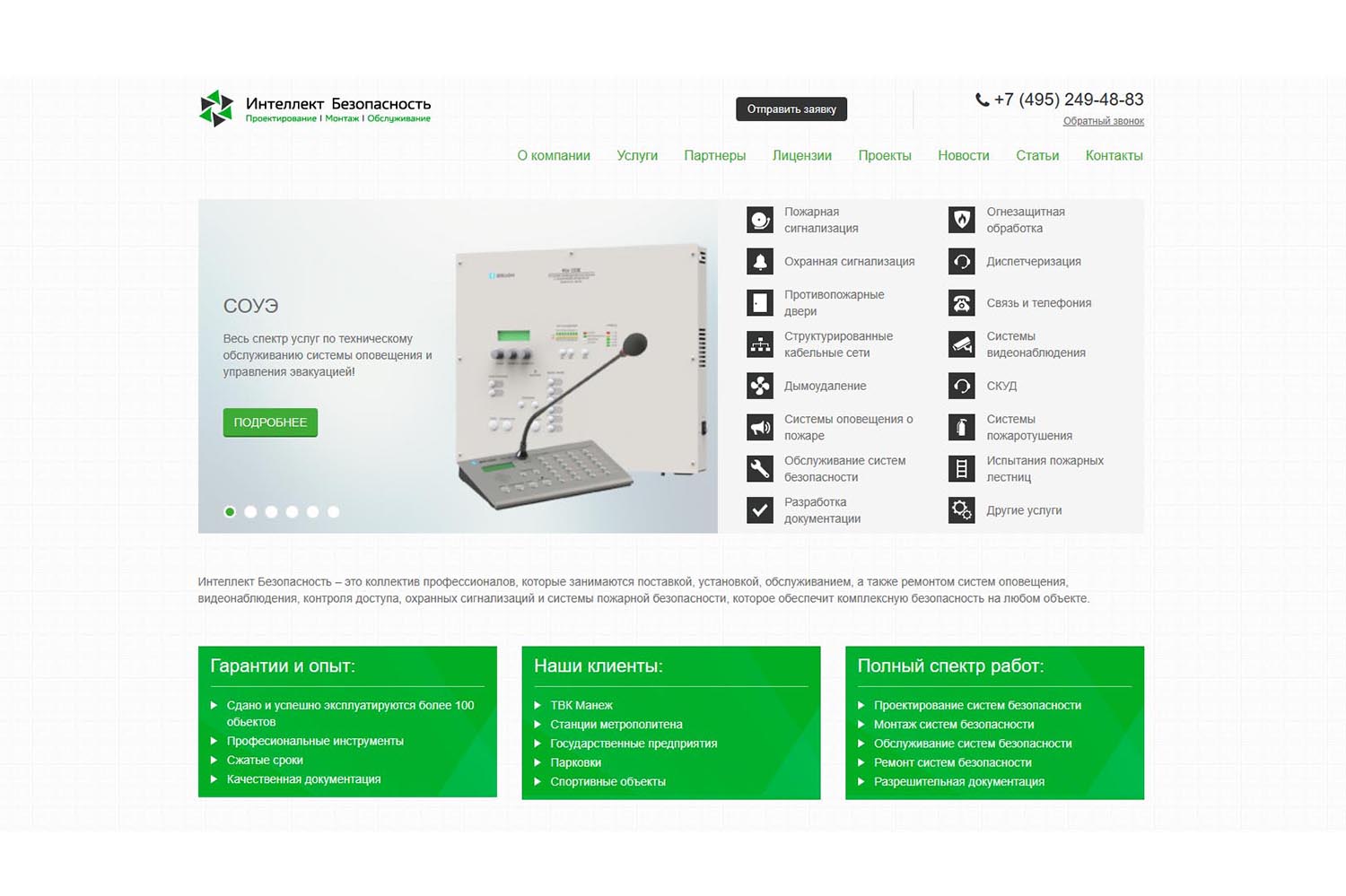 Компания «Интеллект Безопасность» осуществляет проектирование, монтаж и обслуживание систем безопасности коммерческим и государственным организациям в Москве и Московской области. Среди проектов — здания РЖД, подземные городские парковки и торговые центры.