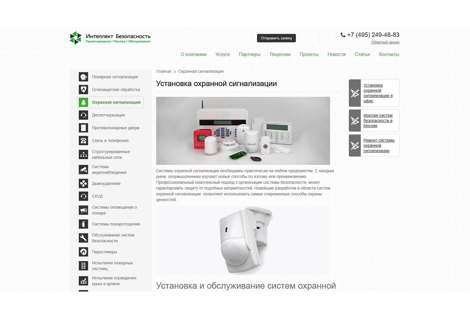 - Установка охранных и пожарных сигнализаций;
