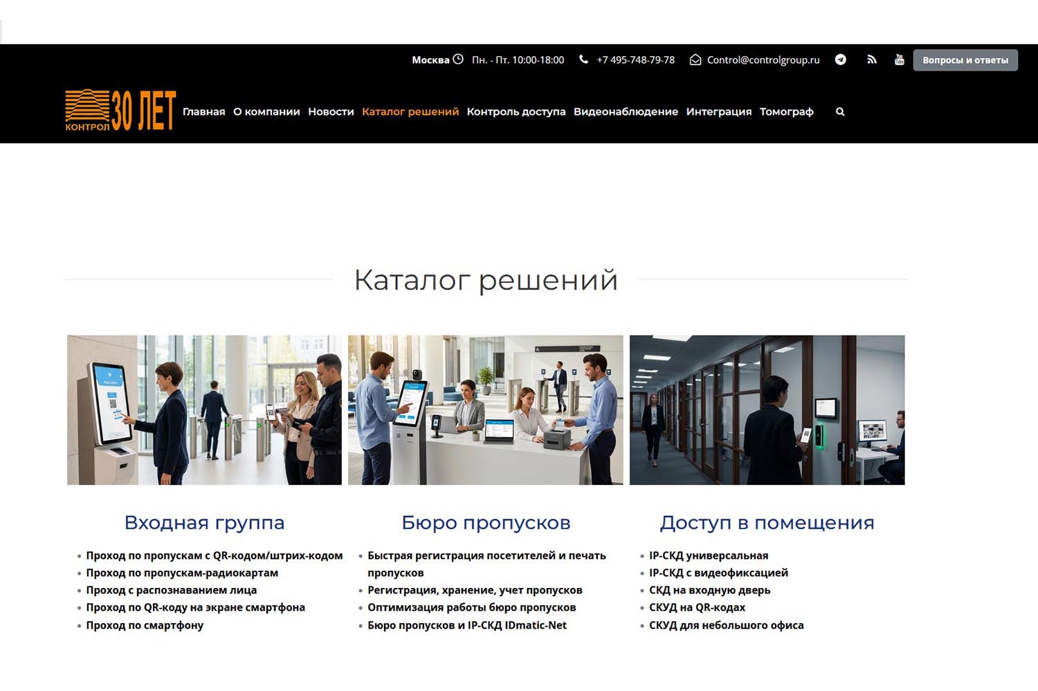 В перечень предлагаемых решений входят системы контроля и управления доступом (СКУД), видеонаблюдение, а также пожарная и охранно-тревожная сигнализация. «МТТ Контрол» оказывает услуги комплексно: обследование объекта, проектирование, изготовление оборудования, разработка ПО, монтаж и пусконаладочные работы, гарантийное и сервисное обслуживание.