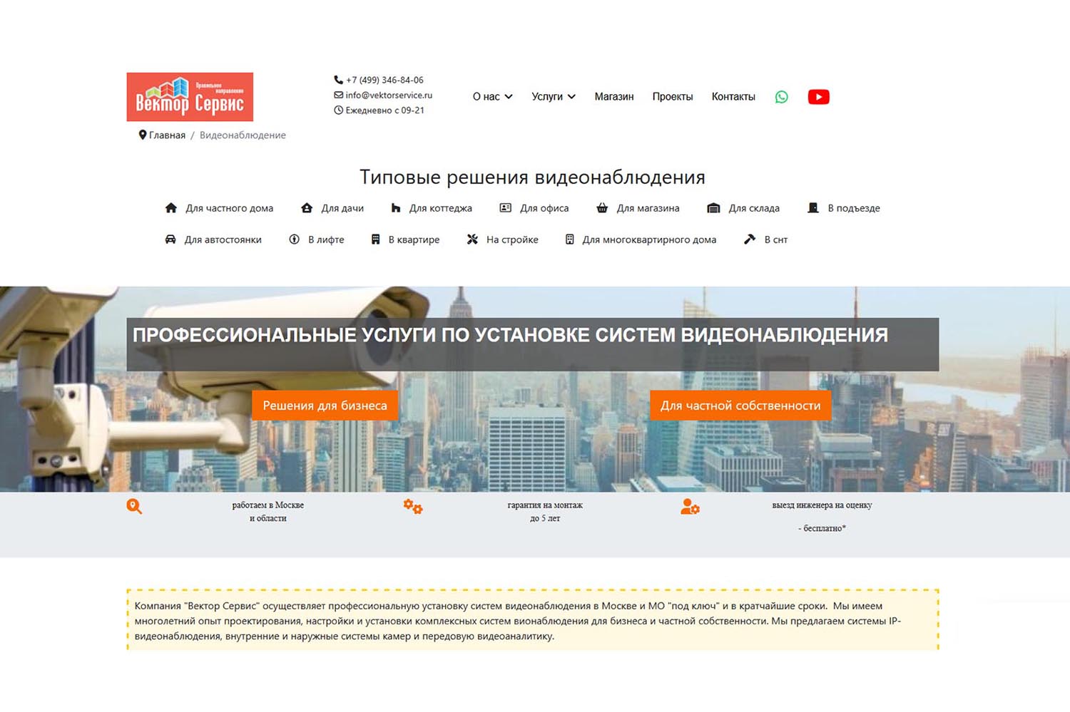 «Вектор Сервис» с 2010 года предоставляет услуги по установке систем безопасности для частных домов, коттеджных посёлков, офисов и других объектов. Компания работает на территории Москвы, Московской области и Центрального региона, сотрудничает с юридическими и физическими лицами.