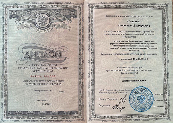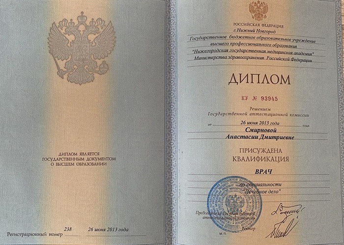 Диплом Нижегородской государственной медицинской Академии по специальности "Лечебное дело».