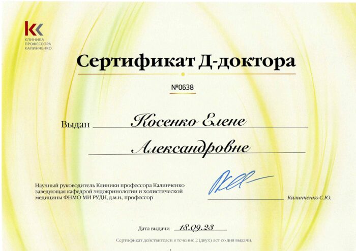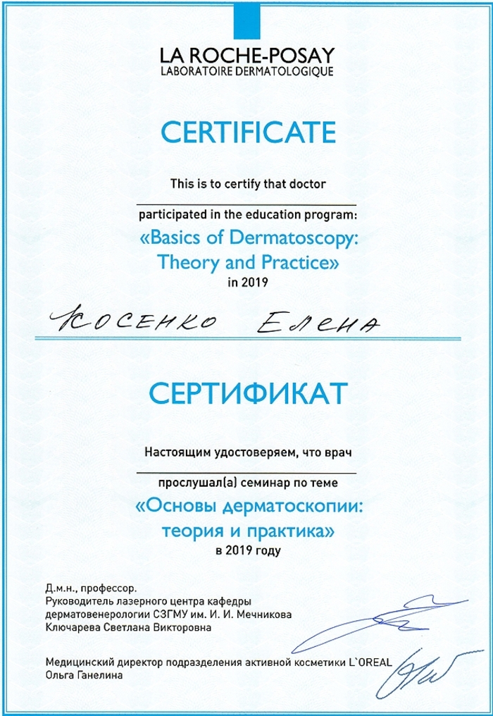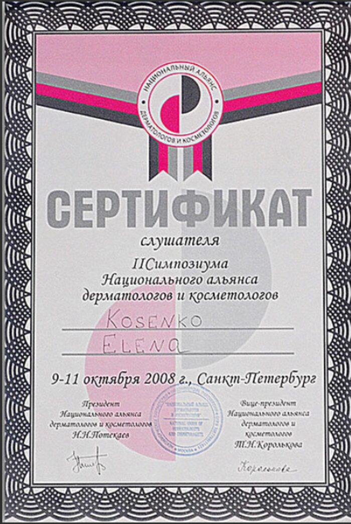2005 г. Закончила медицинскую Академию им. И. И. Мечникова по специальности «Лечебное дело». Получила специализацию в клинической ординатуре по Дерматовенерологии и повысила квалификацию в высшем учебном заведении по направлению: врач-косметолог.