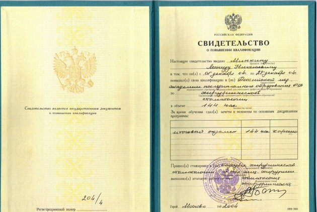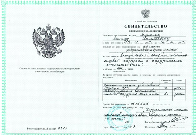 2004 г. — Российская медицинская академия последипломного образования (РМАПО) (стоматология хирургическая — повышение квалификации)