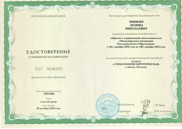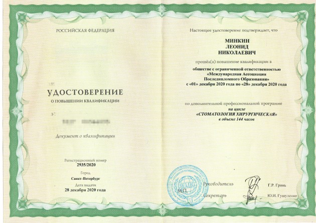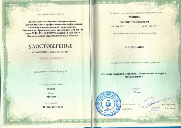 1997 г. — Московский государственный медико-стоматологический университет Евдокимова (стоматология хирургическая — повышение квалификации)