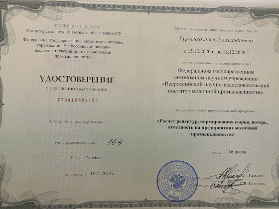 - 2020 год — «Расчет рецептур, нормирование сырья, потерь, отчетность на предприятиях молочной промышленности», ФГАНУ «ВНИМИ», НОЦ «Инновационные технологии»;