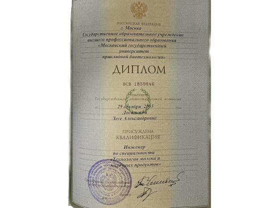 - 2005 год — Московский государственный университет прикладной биотехнологии, инженер по специальности «Технология молока и молочных продуктов».