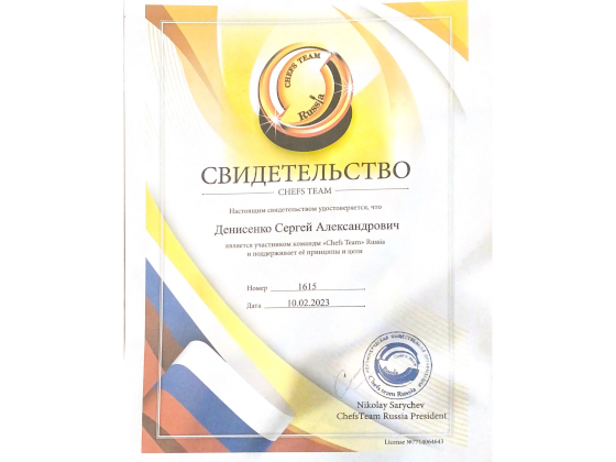 Обучался в г. Самара на повара-кондитера. Опыт работы более 7 лет. Действующий член гильдии шеф-поваров Поволжья и член Российской Гильдии шеф-поваров Chefs Team Russia.