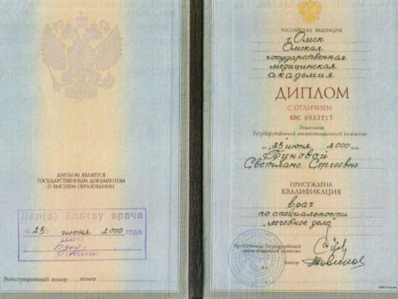 2000 г. - Омская государственная медицинская академия (лечебное дело). С отличием. Базовое образование.