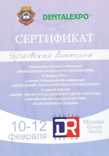 2014 г. — профессиональная переподготовка по специальности «Стоматология терапевтическая»