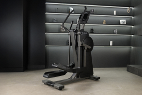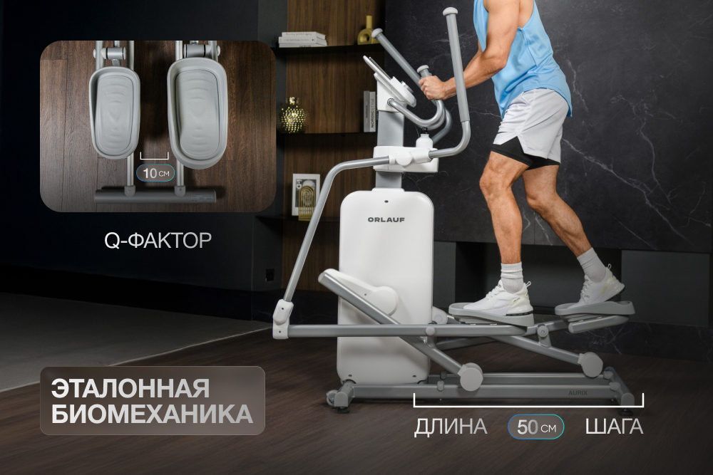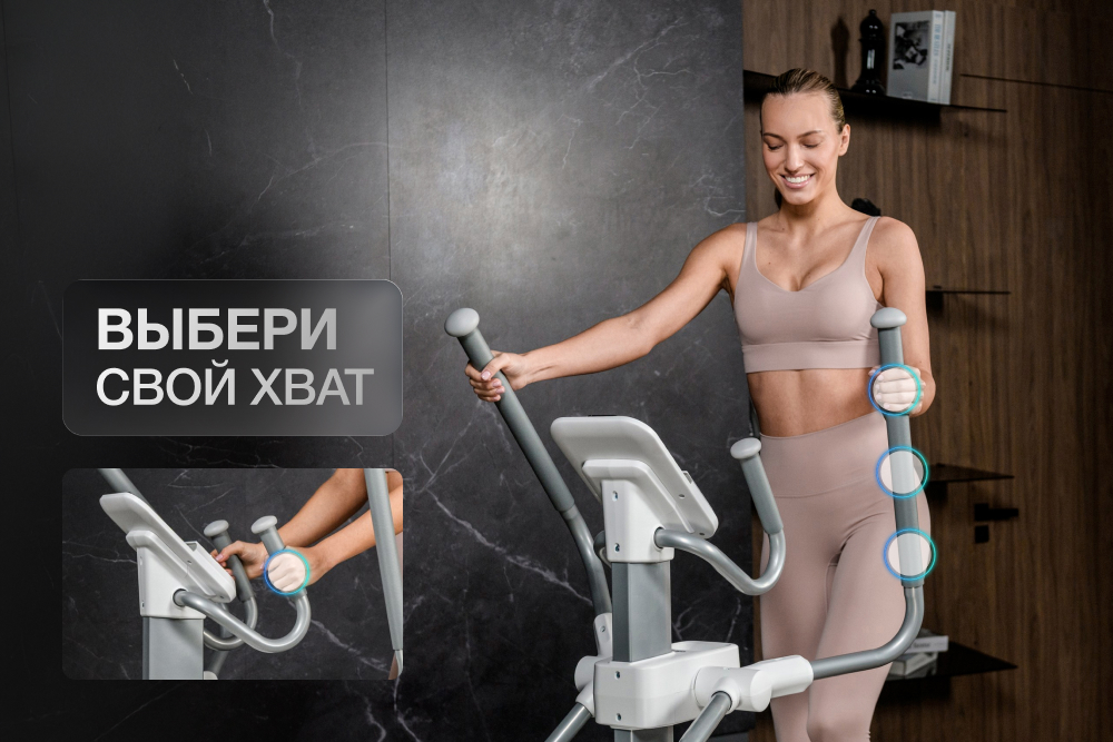 Длина шага 50 см и Q-фактор 10 см способствуют анатомически правильному положению корпуса и стоп, а также эталонную биомеханику. Такая геометрия подходит пользователям ростом до 205 см и ощутимо снижает нагрузку на коленные суставы. Многопозиционные поручни с мягким нескользящим покрытием дают возможность менять хват, смещая акцент с мышц ног на спину и грудные мышцы.