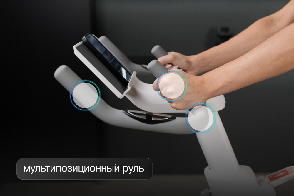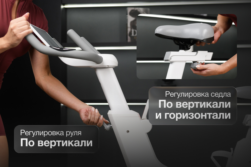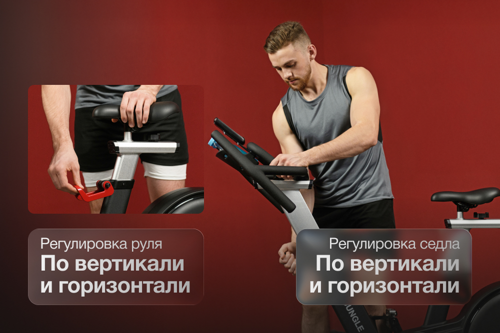 У седла спин-байка две плоскости регулировки — вертикальная и горизонтальная. Можно подстроить геометрию посадки под индивидуальные анатомические параметры. Руль также регулируется по высоте, позволяя подобрать удобное положение для рук и спины. В совокупности диапазон настроек рассчитан на пользователей ростом до 200 см, благодаря чему мышечная нагрузка распределяется равномерно, а комфорт сохраняется даже при многочасовых тренировках.