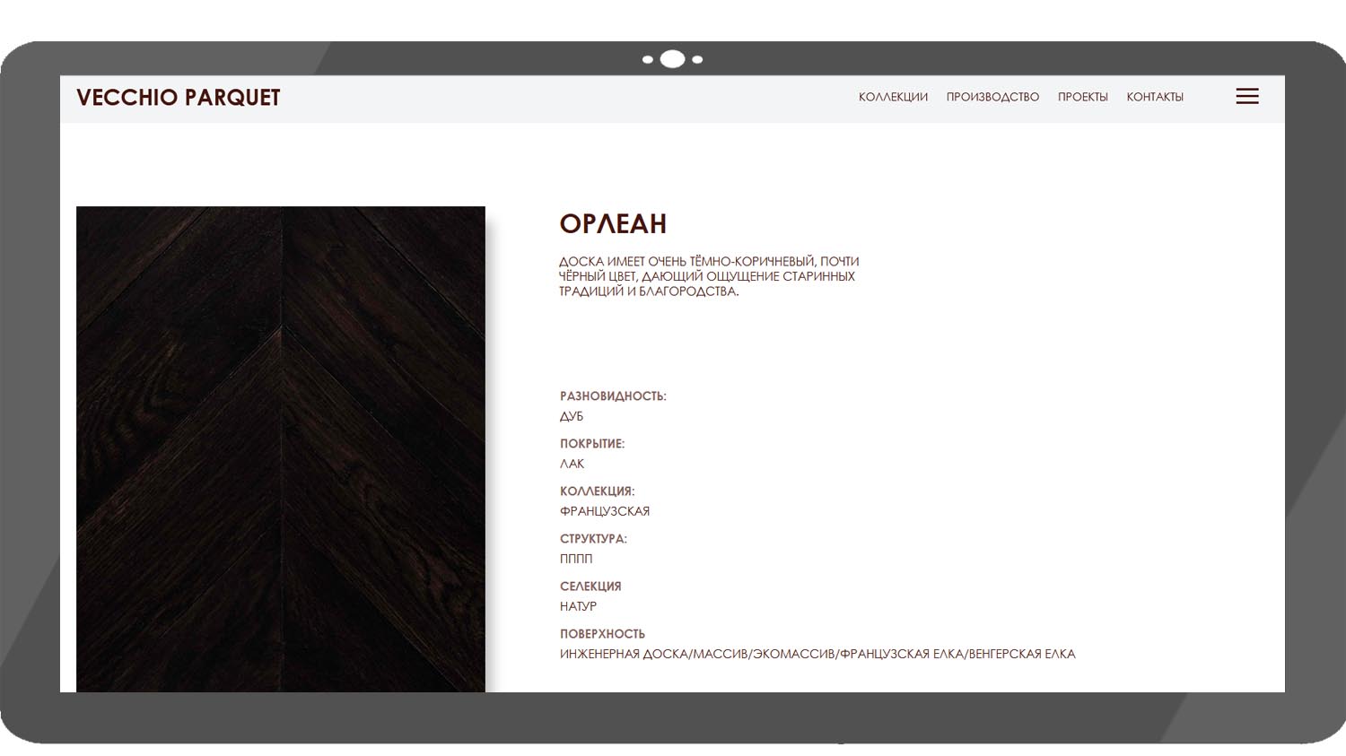 Vecchio Parquet «Орлеан» — инженерная доска темно-коричневого, почти черного цвета с эффектом состаривания. Модель предлагается в нескольких вариантах нарезки и форматах плашек: «французская елка», «венгерская елка», «массив». Вы можете заказать любой вариант в зависимости от дизайна помещения.