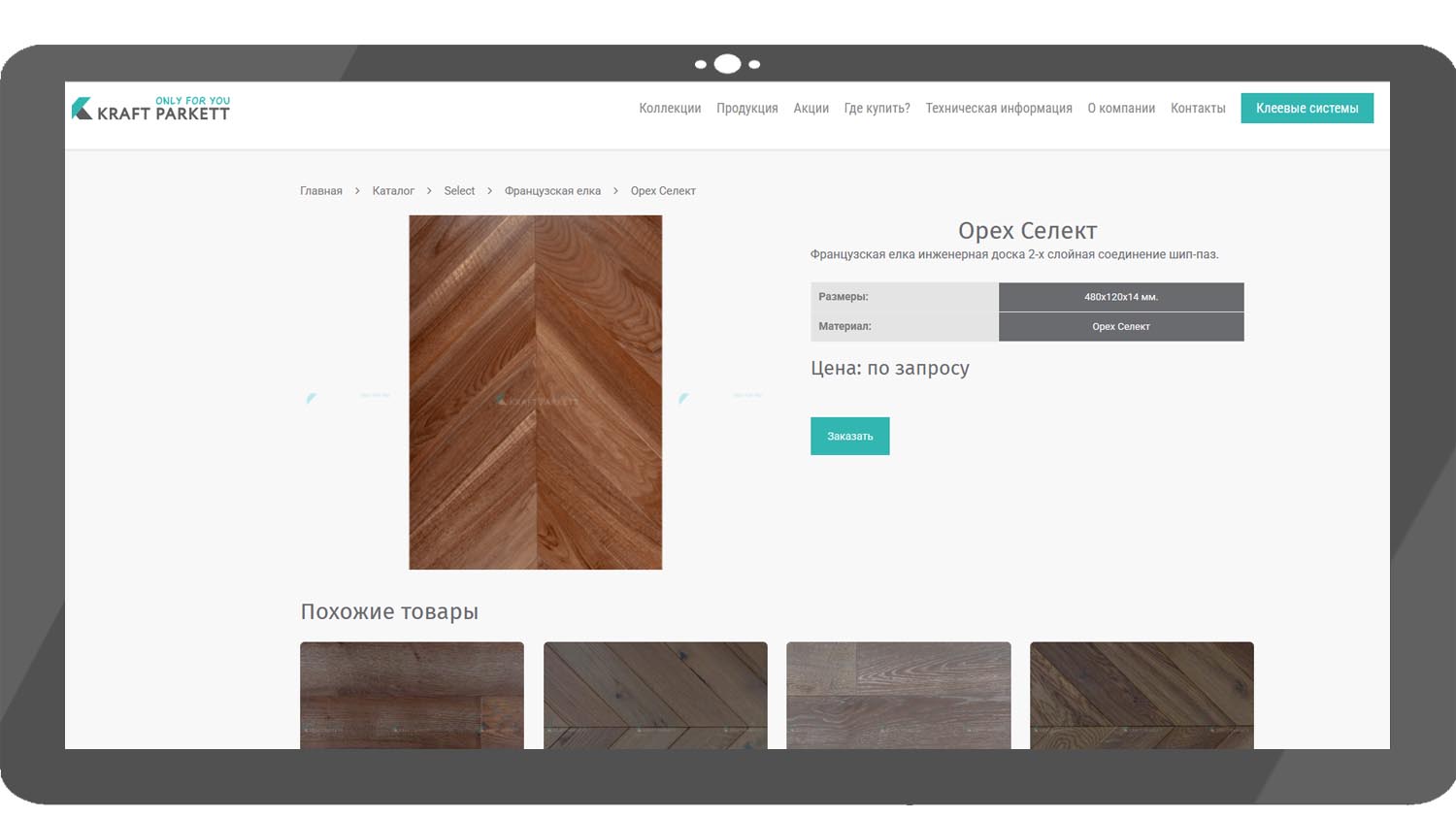 Kraft Parkett «Орех Селект» — инженерная доска для укладки рисунком «французская елка». Все планки одного размера — 480×120×14 мм, это формирует готовый модуль для сборки. Соединение «шип-паз» упрощает укладку, исключая трудоемкий подбор узора. Одна упаковка покрывает площадь 1 м², облегчая расчет необходимого материала.