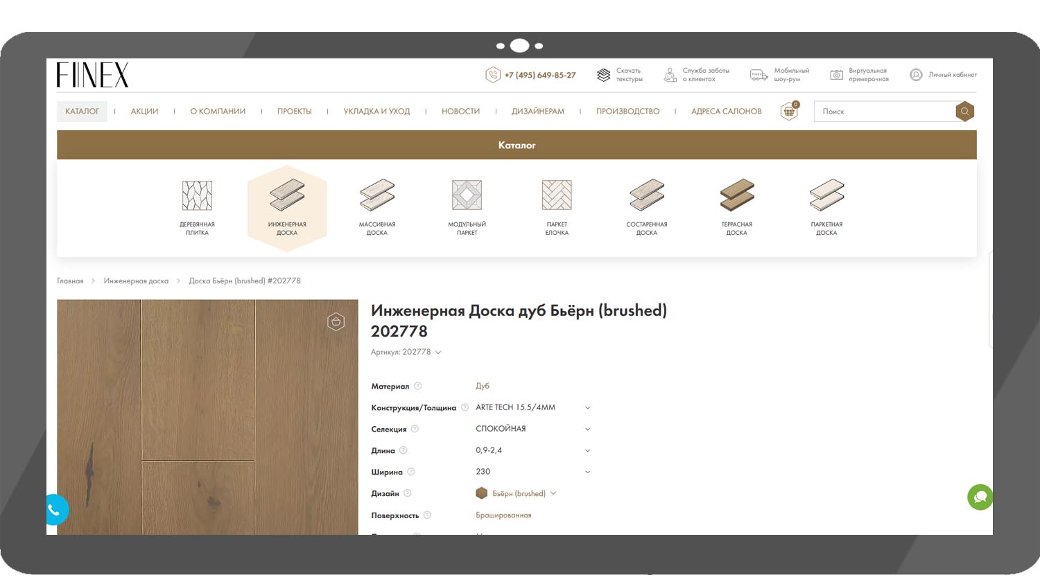 Finex «Дуб Бьерн» — инженерная доска с основанием из прочной березовой фанеры. Этот материал демонстрирует стабильность при перепадах влажности и температуры в помещении, сохраняет геометрию и, при соблюдении технологии укладки, исключает появление зазоров между планками и скрипа пола. Верхний слой доски выполнен из дуба толщиной 4 мм, рассчитан на несколько циклов полного шлифования. Это позволяет обновлять покрытие по мере износа без значительных финансовых затрат.