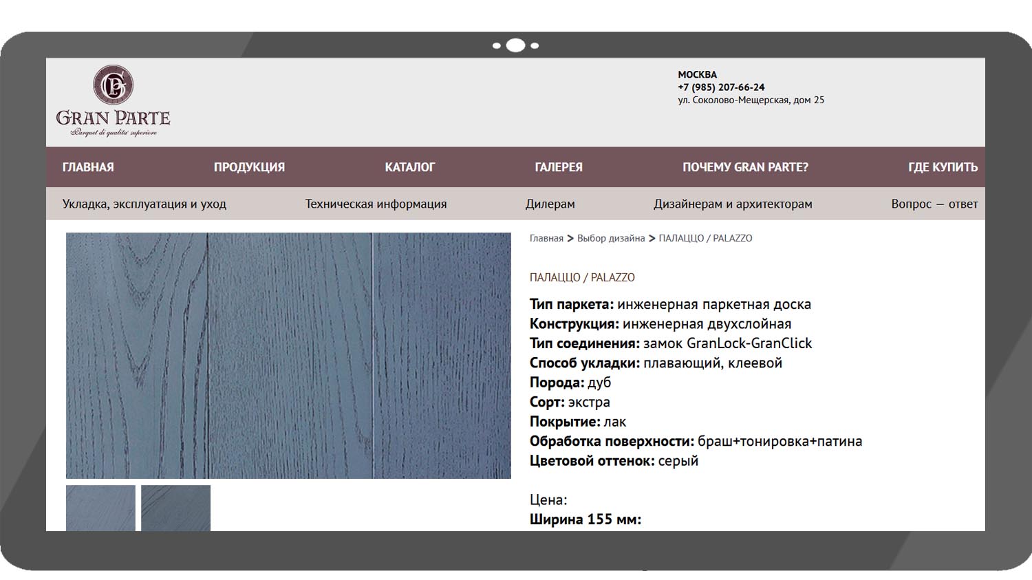 Gran Parte Palazzo — двухслойная инженерная доска. Верхний слой толщиной 3,3 мм выполнен из дуба, основание — из влагостойкой фанеры. Такая конструкция снижает риск деформации покрытия при изменении уровня влажности в помещении, например в начале и конце отопительного сезона.