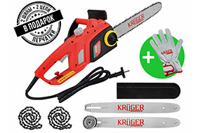 Натяжение цепи осуществляется бесконтактным способом путем вращения крышки натяжителя. Производитель дает на пилу гарантию сроком 1 год. Также “Крюгер” производит бензиновую модель цепной пилы мощностью 4,5 л. с.