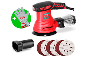Вместе со шлифмашиной идут три комплекта (по 10 штук) шлифовальных дисков с разной зернистостью: Р60, Р80 и Р100. Инструмент можно сразу опробовать в деле, не покупая расходные материалы. Также в комплект входят защитные перчатки, подробная инструкция на русском языке и гарантийный талон.
