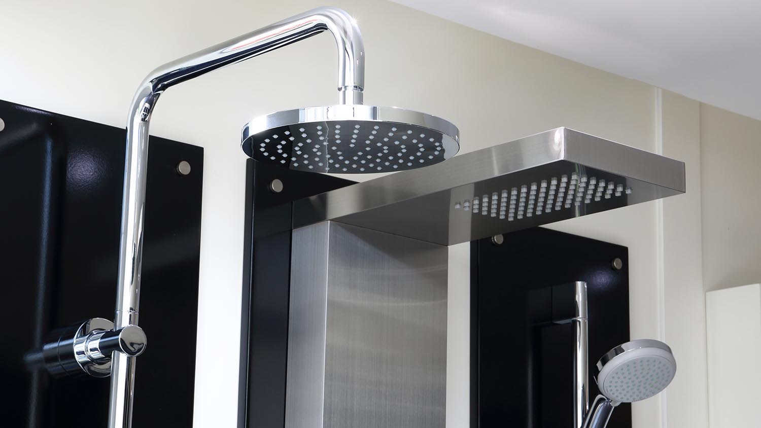 Китайская душевая панель. У нее есть подсветка, температурный датчик. Причем работают они без подключения к электричеству — от встроенного водного генератора. Вода может подаваться из лейки, тропического душа, излива и специальных отверстий (форсунок) для гидромассажа.