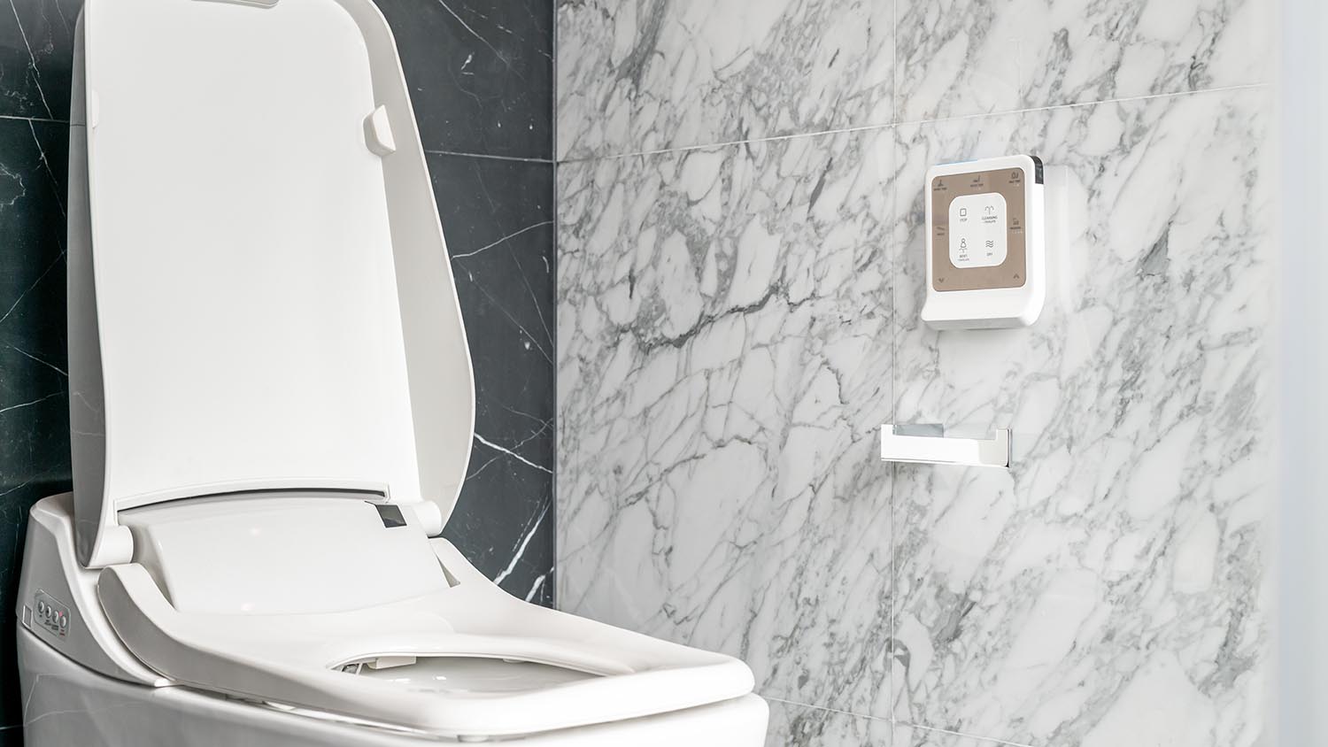 Южнокорейский девайс. В сиденье встроен подогрев, три режима — от 36 до 40 °C. У него нет бачка, и не нужно устанавливать инсталляцию (это бачок, который убирается в стену — чаще за гипсокартон). Унитаз подключается напрямую к водопроводу, смыв автоматический. Есть отсек для гигиенического средства — унитаз будет автоматически обрабатываться после каждого использования. С торца сидушки расположена панель управления биде, подсветки и сушки.