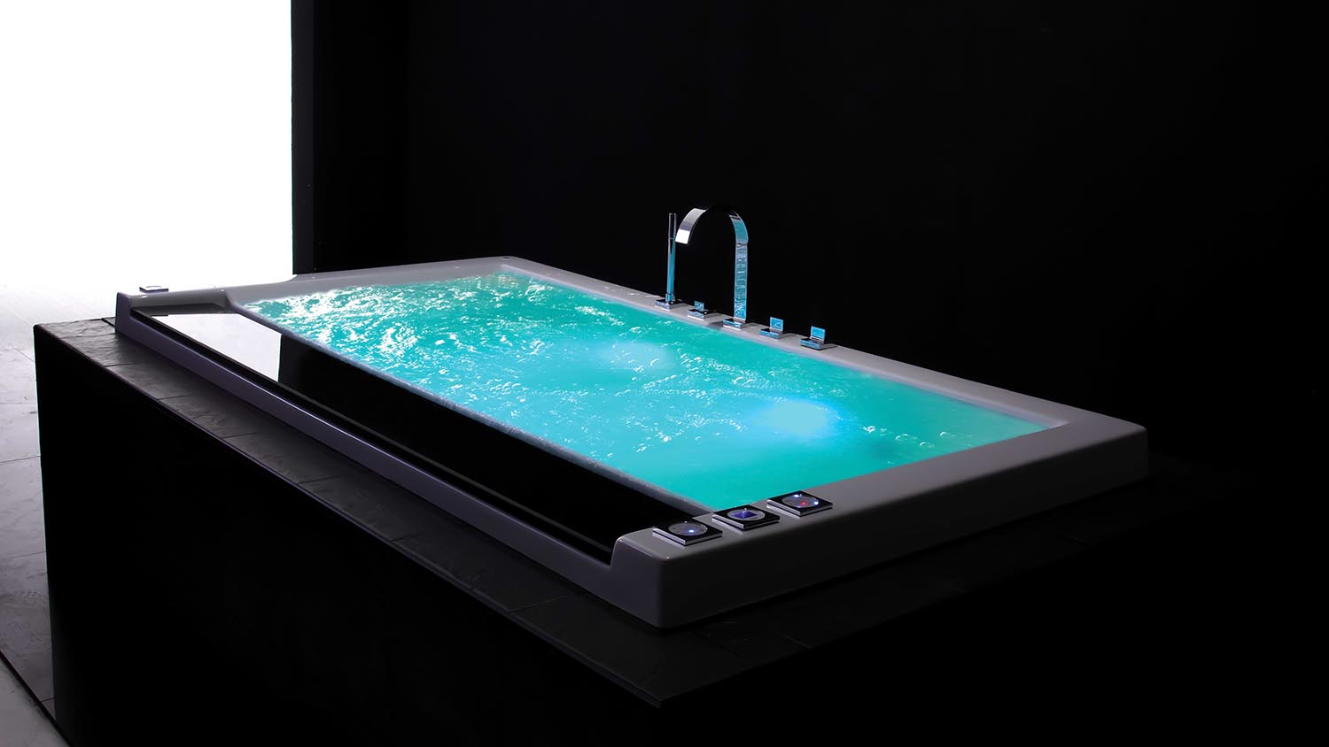 Ее можно назвать компактным джакузи. Сделана в Германии. В длину и ширину она 150 на 150. На передней панели выполнена вставка из закаленного стекла — чисто дизайнерское решение. Ведь у устройства есть подсветка плюс режим хромотерапии. Это «оздоровление цветом» — психосоматический метод для снятия стресса. Плюс есть режимы аэро- и гидромассажа.