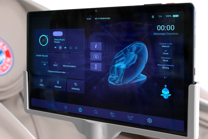 Управление массажным креслом осуществляется с помощью удобного русифицированного планшета. А для того чтобы процесс расслабления был максимальным, в кресле встроены 3D объемные динамики HI-FI уровня с подключением по Bluetooth, чтобы пользователь мог наслаждаться любимой музыкой.